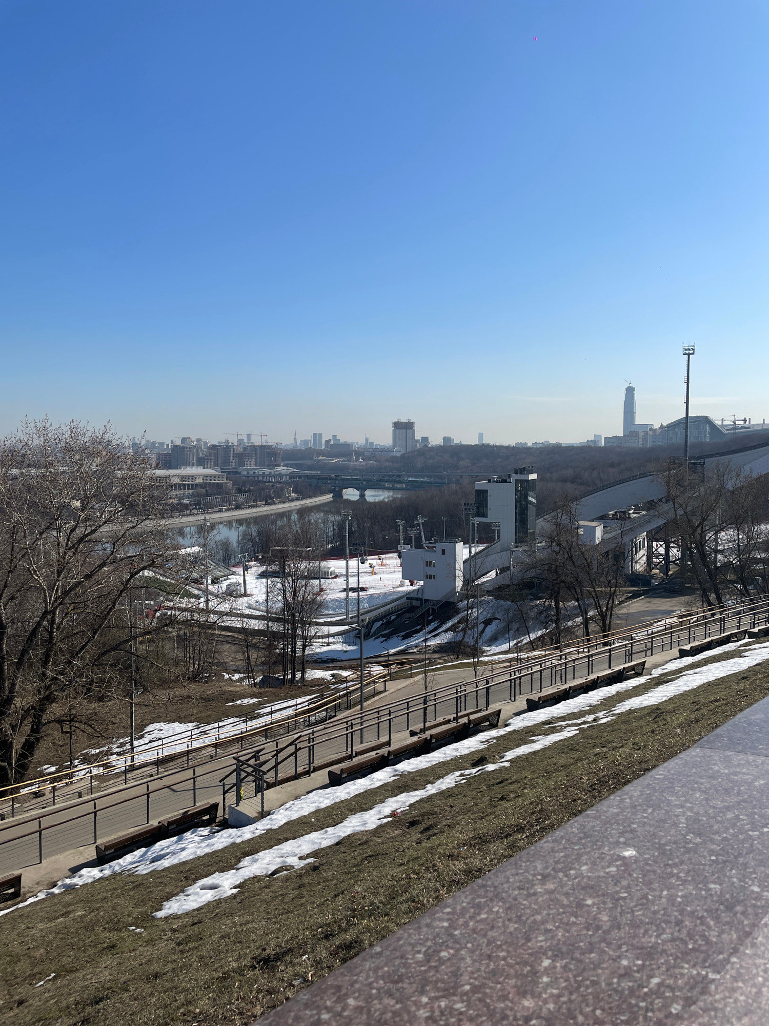 The image depicts an elevated perspective of a cityscape, likely Moscow, Russia, on a clear day. The foreground shows a concrete or stone structure, possibly a wall or part of a building, with patches…read more