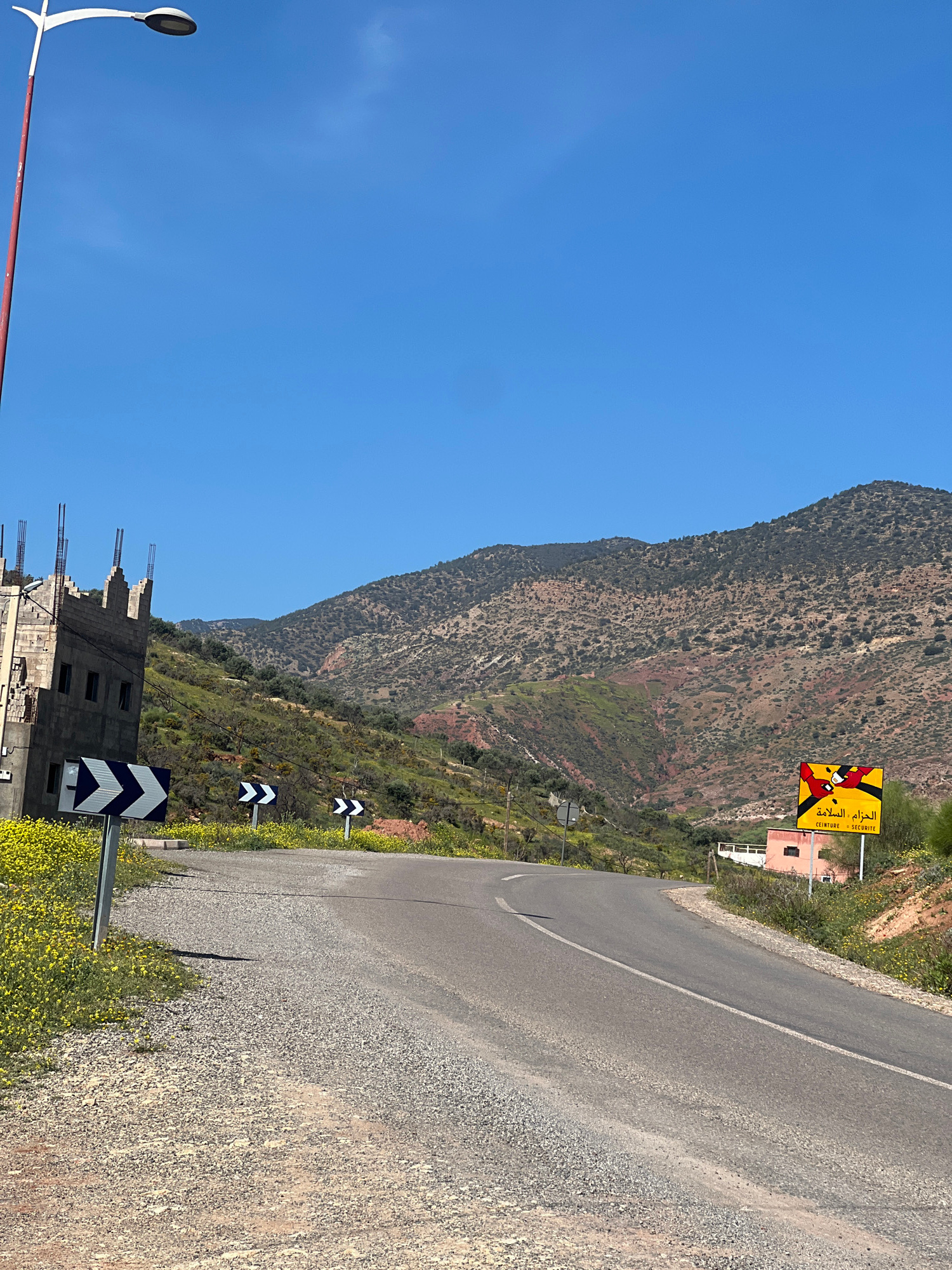 The image depicts a road in Ouaouizert, Morocco, flanked by a mountain on one side and a roadside on the other. The road surface is asphalt with a white center line. Roadside markers with black and wh…read more