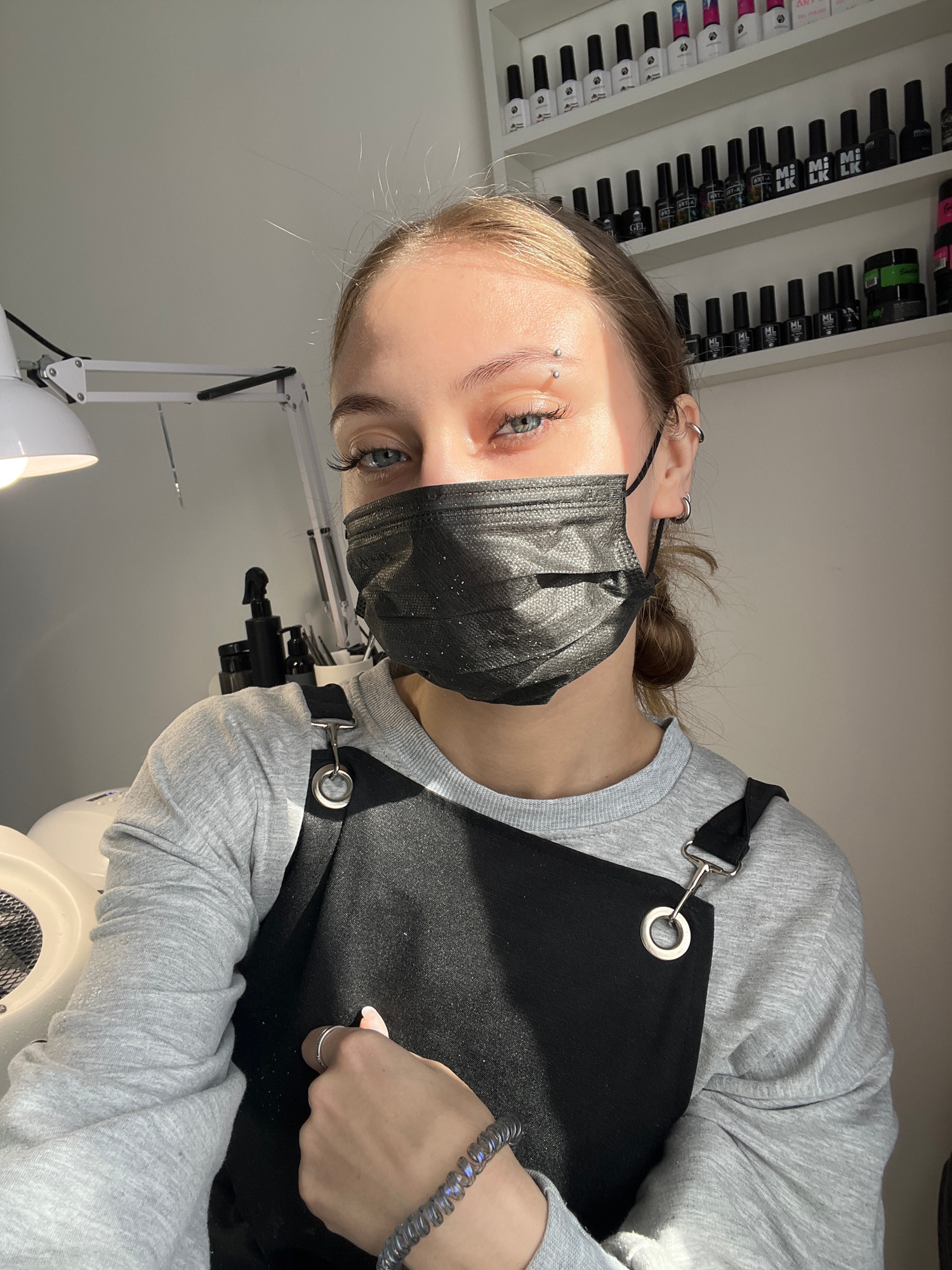 A young woman is prominently featured in a close-up shot, positioned vertically. She is indoors, likely in a nail salon or beauty studio in Фоки, Russia, indicated by the shelves of nail polish bottle…read more