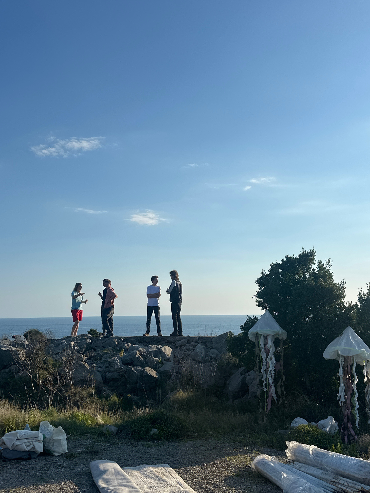Four individuals stand near a rocky cliff edge overlooking the sea, under a clear sky in Radovići, Montenegro. The ground is rocky, with scattered vegetation and cloth-like debris. Two jellyfish-like…read more