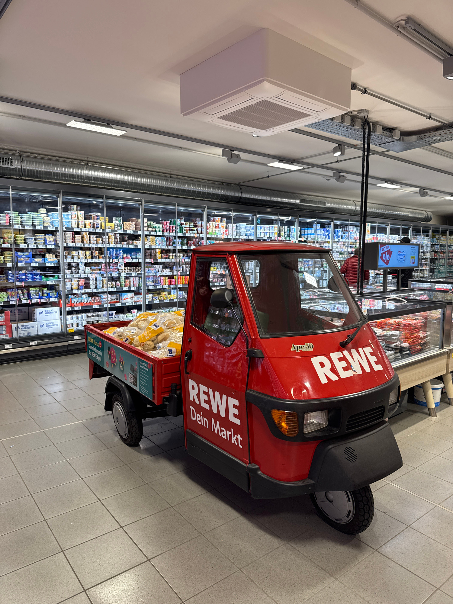 The image shows a red, three-wheeled vehicle branded with "REWE Dein Markt" (REWE Your Market) parked inside a REWE supermarket in Remscheid, Germany. The vehicle, identified as an Ape50, has a small…read more
