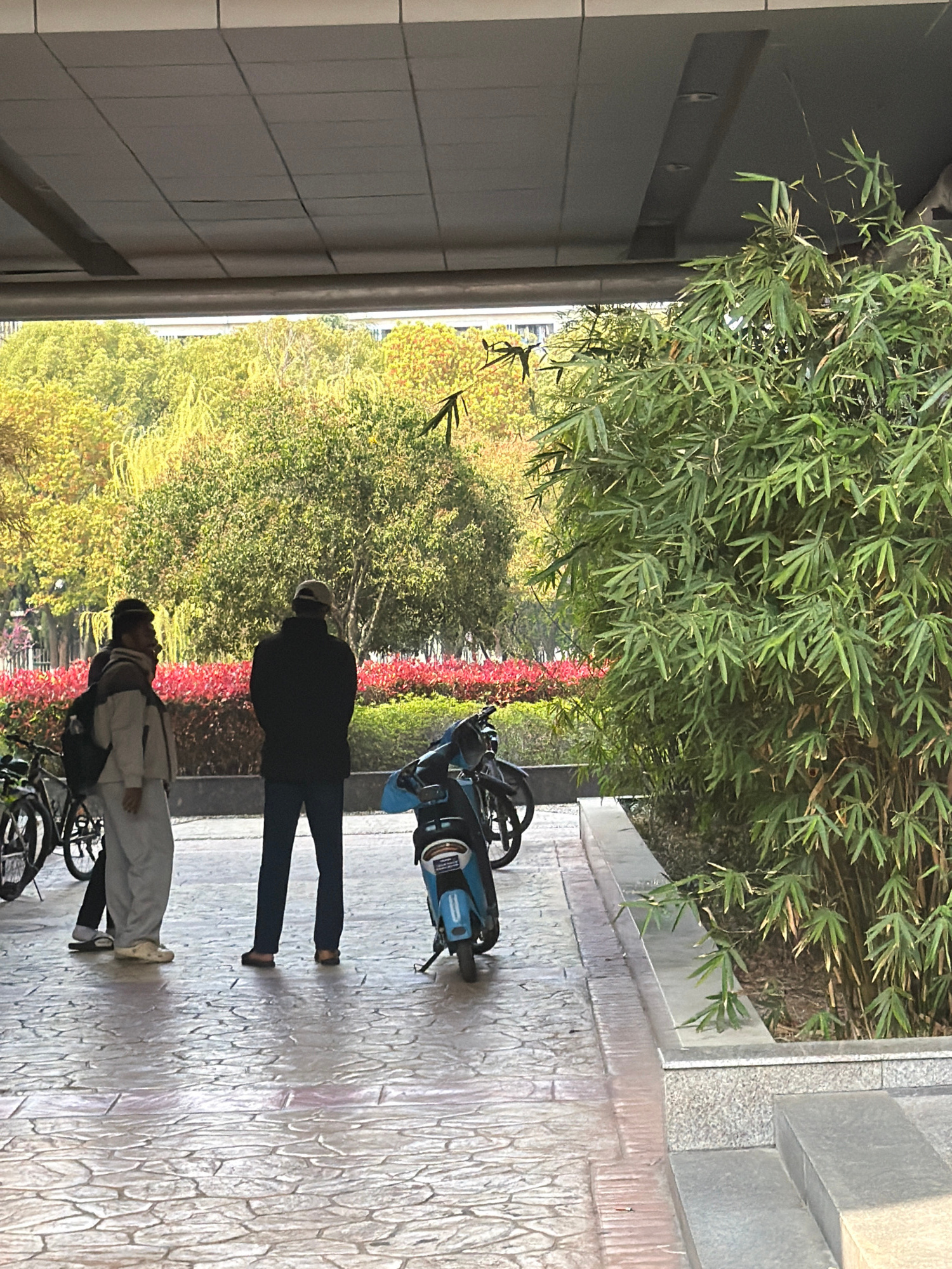 The image depicts a scene in Jiangning District, China, showing a sidewalk with a patterned surface. A row of red flowers separates the sidewalk from a park-like area with trees and greenery. Two indi…read more