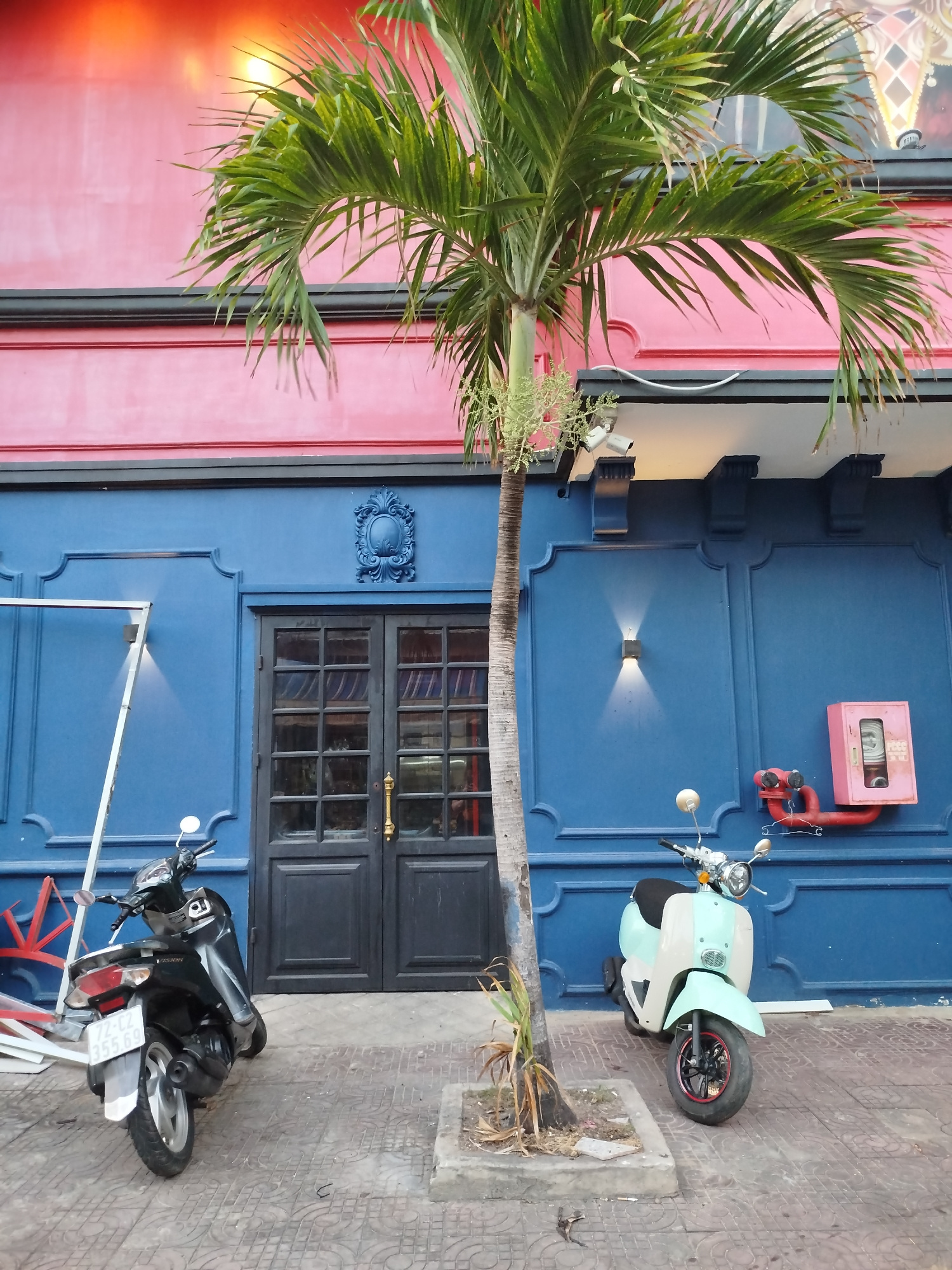 The image depicts a street scene in Ho Chi Minh City, Vietnam. The focal point is the exterior of a building with a two-tone facade: a red upper section and a blue lower section. In the center of the…read more