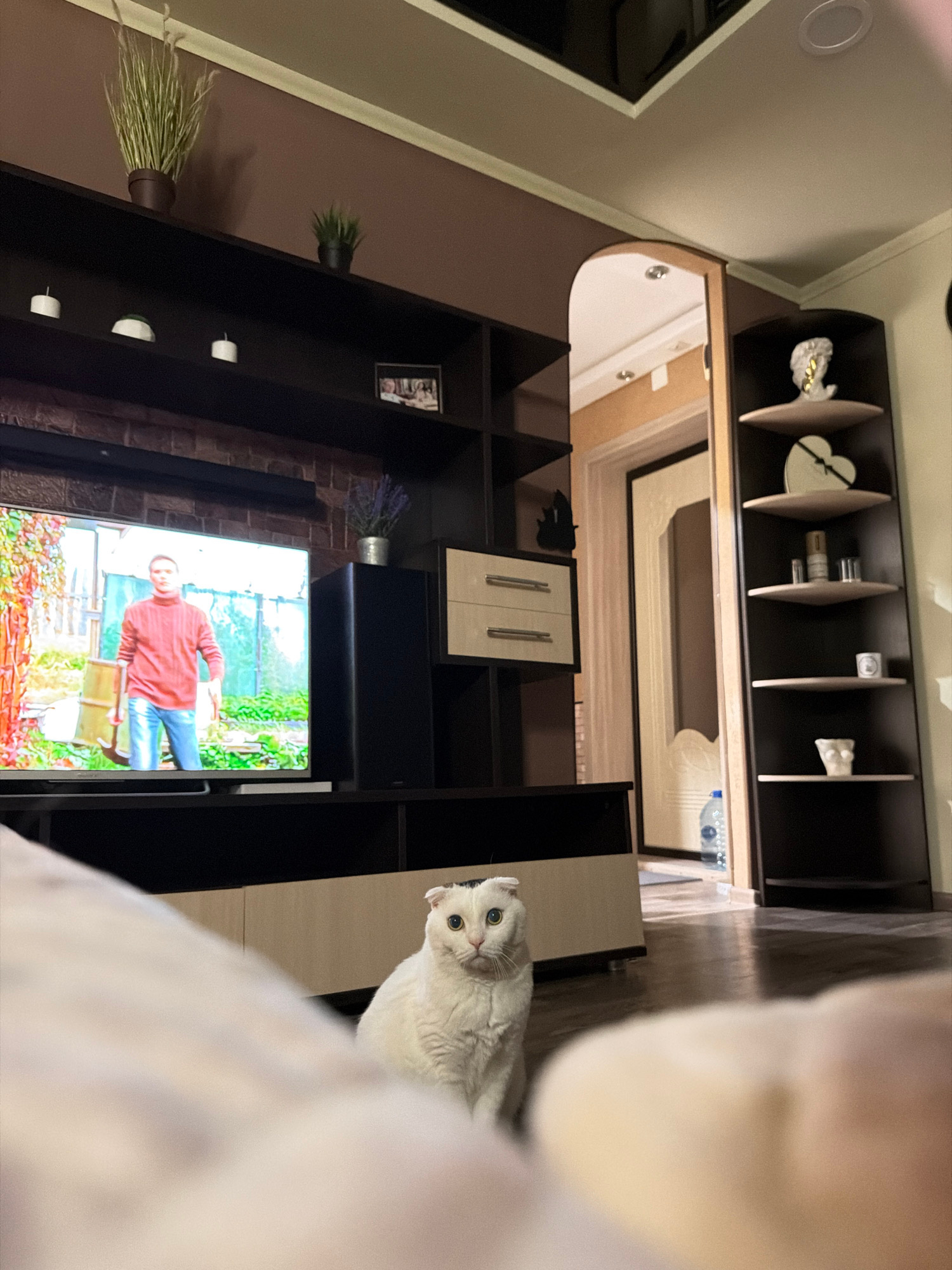 The image shows a living room interior, likely located in an apartment in Chaikovsky, Russia, based on the presence of typical Russian design elements. A white cat is prominently positioned in the for…read more