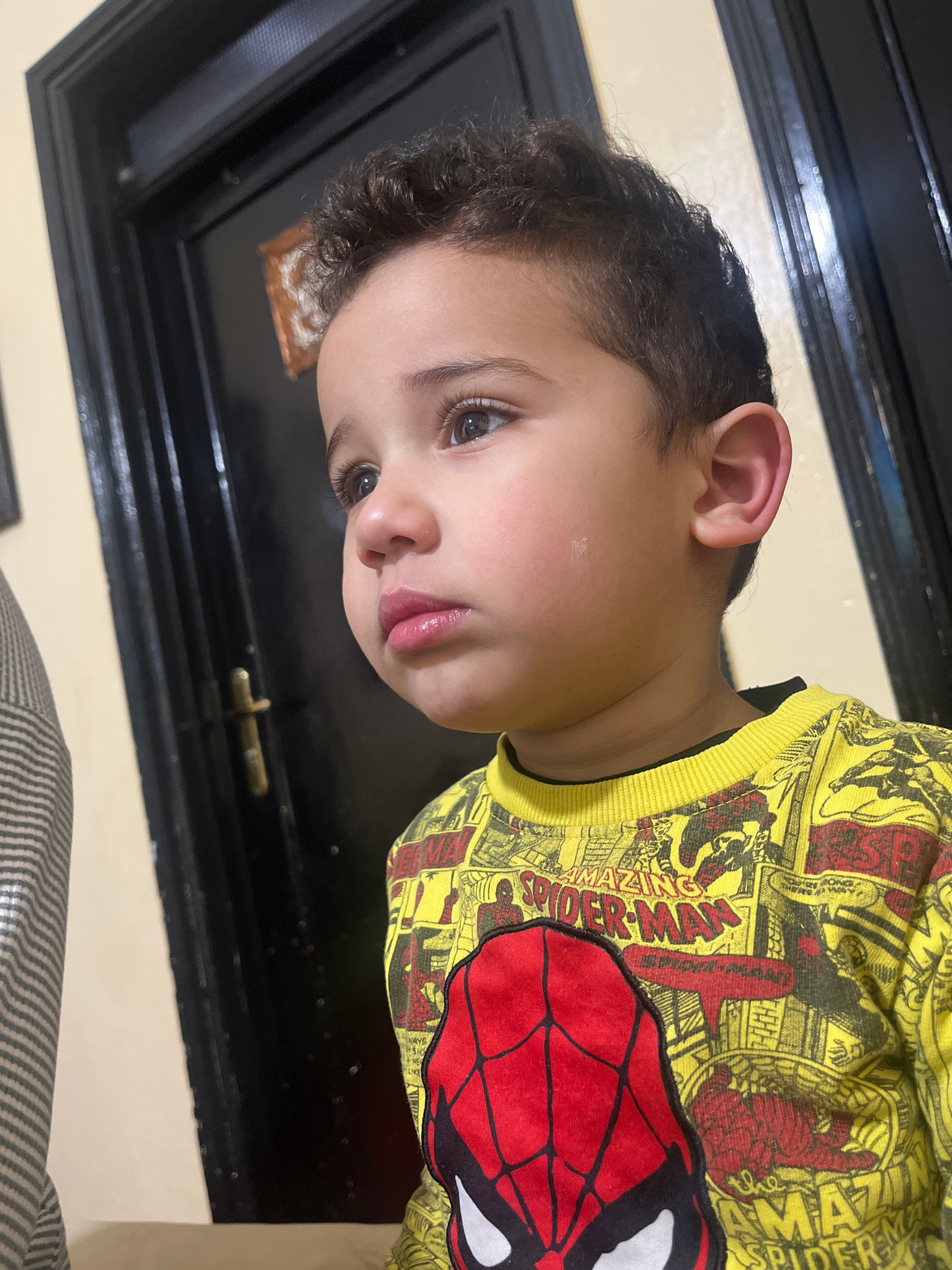 A young child wearing a yellow and red Spiderman sweatshirt is shown in a close-up, angled, indoor shot. The child has dark curly hair, fair skin, and light-colored eyes. A small, light-colored mark i…read more