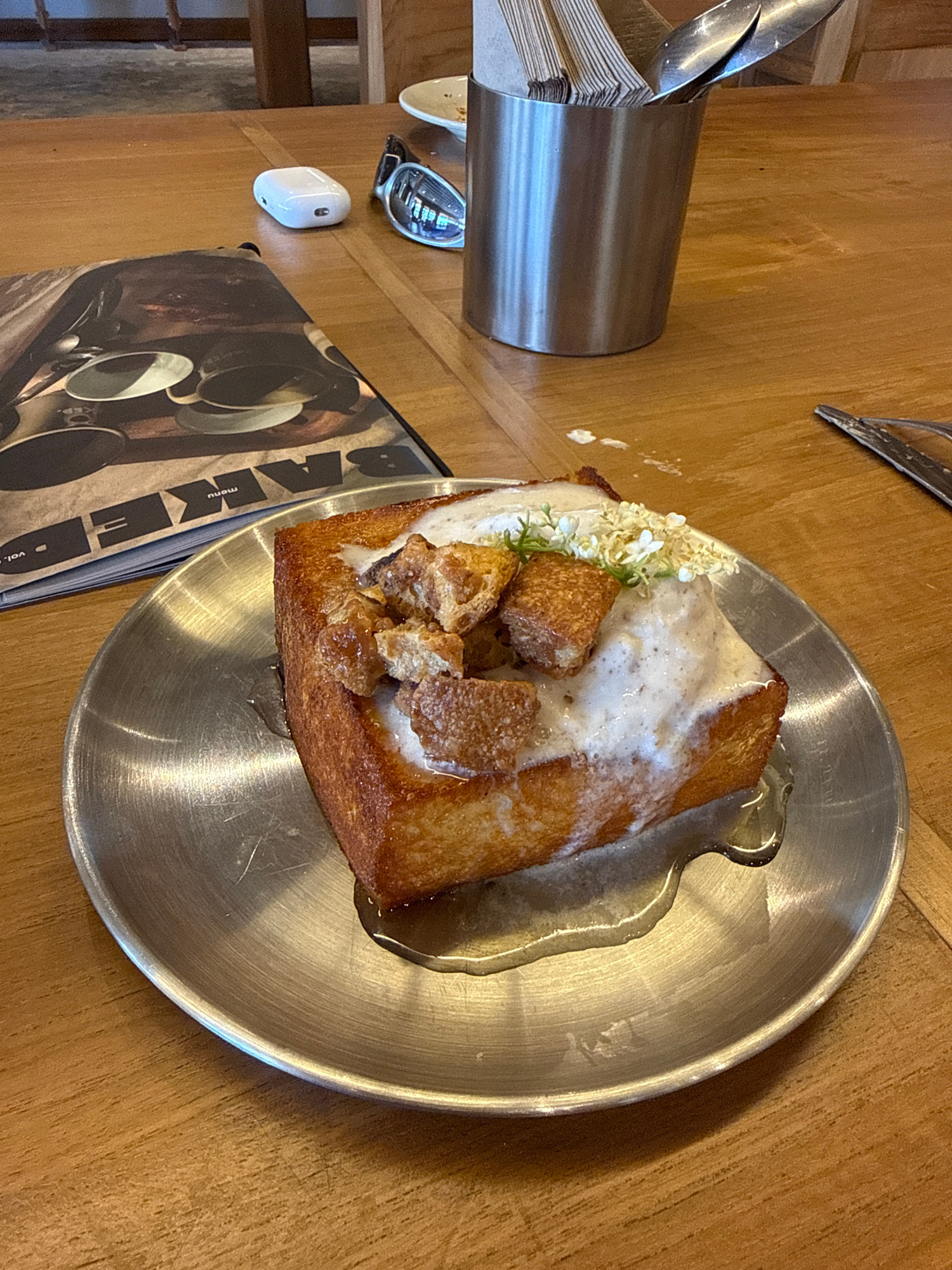 The image shows a wooden table with a silver metal plate holding a piece of thick-cut toast. The toast is topped with a white sauce, small fried croutons, and some small white flowers. A translucent sā¦read more