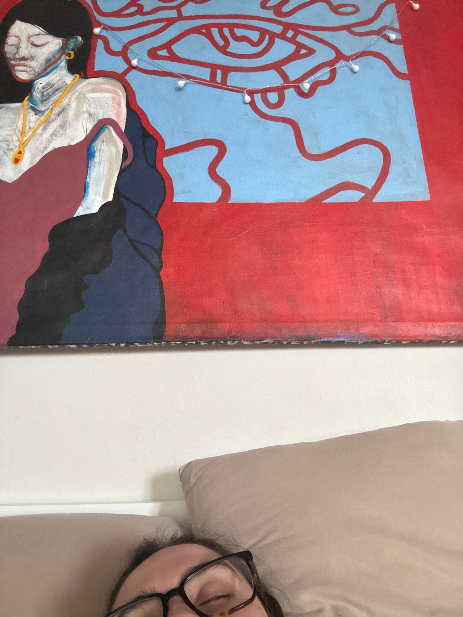 The image depicts a partially visible person lying on a bed with their head near a pillow. The person is wearing glasses. Next to the bed is a painting with a red background, a blue section with red l…read more