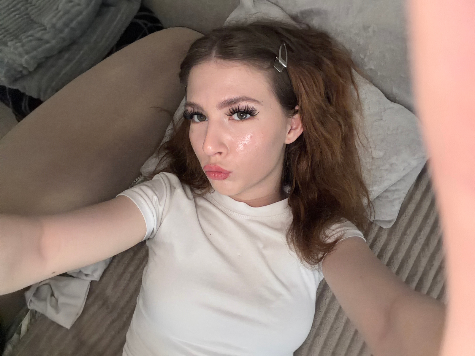 A young woman with auburn hair and fair skin is lying on her back on what appears to be a gray sofa or bed. She is wearing a white t-shirt. Her arms are raised above her head. A silver barrette is vis…read more