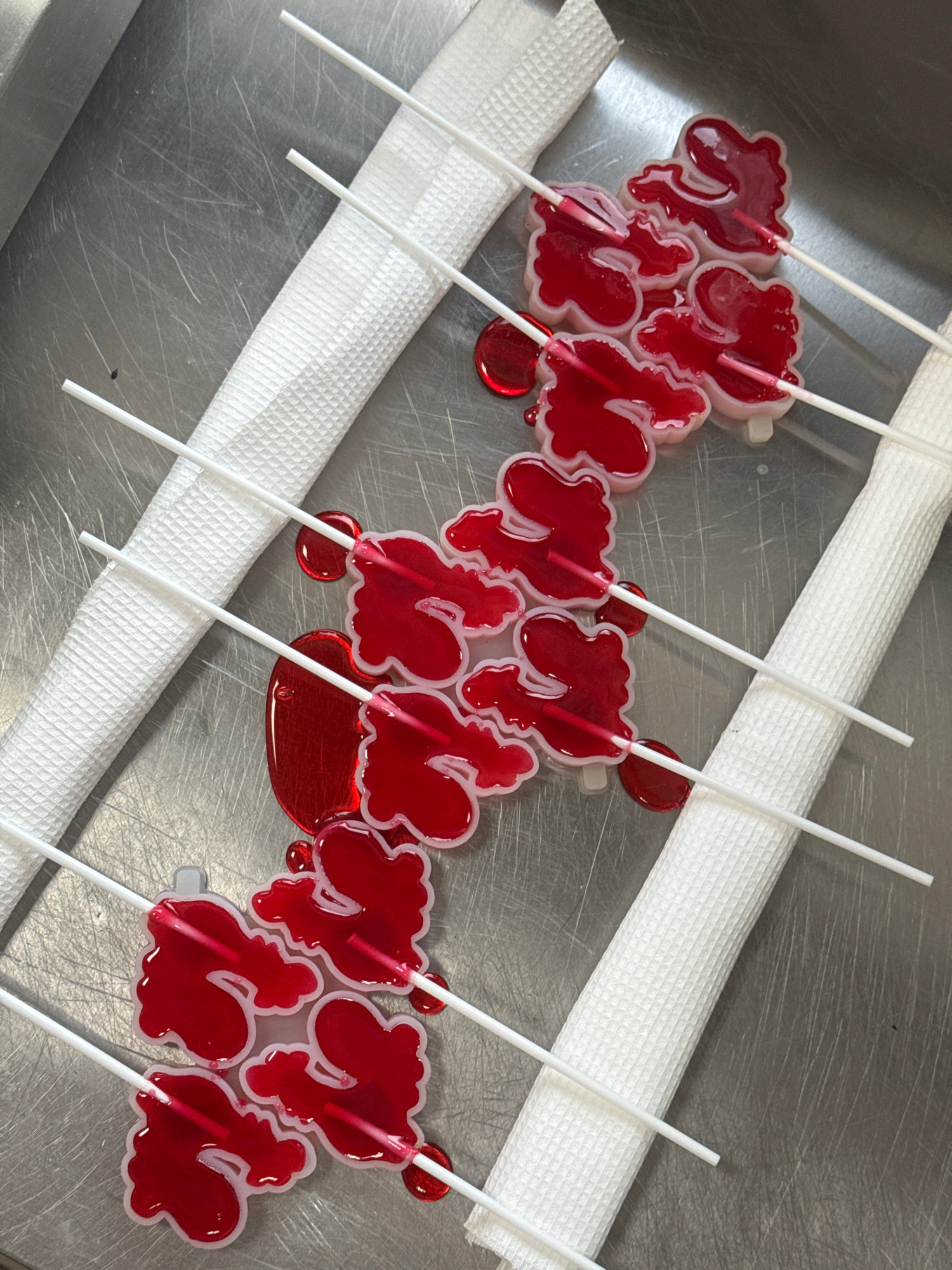The image shows a metal tray with a row of red, candy lollipops shaped like Cyrillic letters with white plastic sticks. The lollipops are resting on two rolled white towels. The setting appears to be…read more
