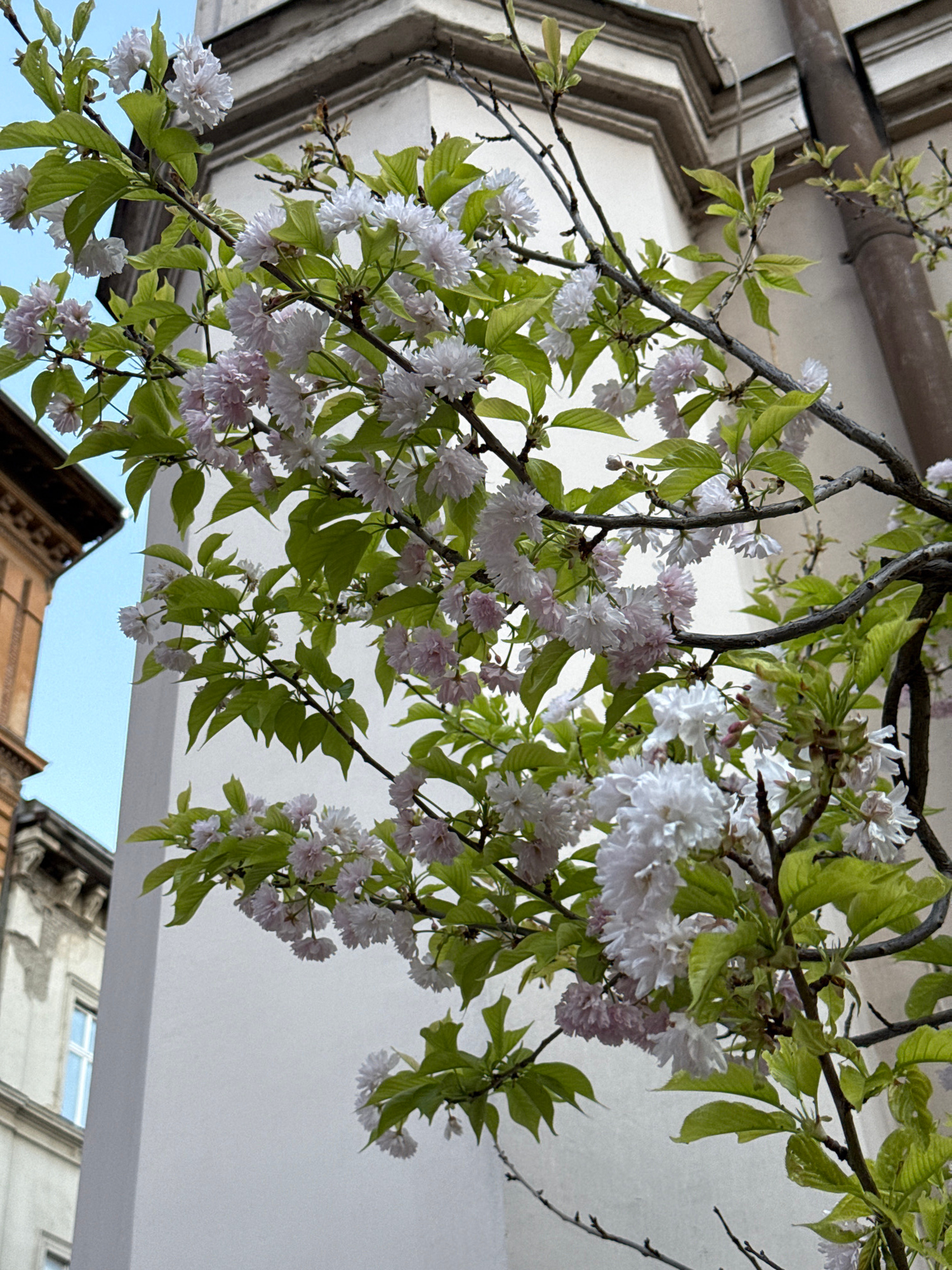 View looking up at blossoming tree branches with green leaves and white and light pink flowers. The branches hang down in front of buildings. The buildings have white walls with brown and gray archite…read more