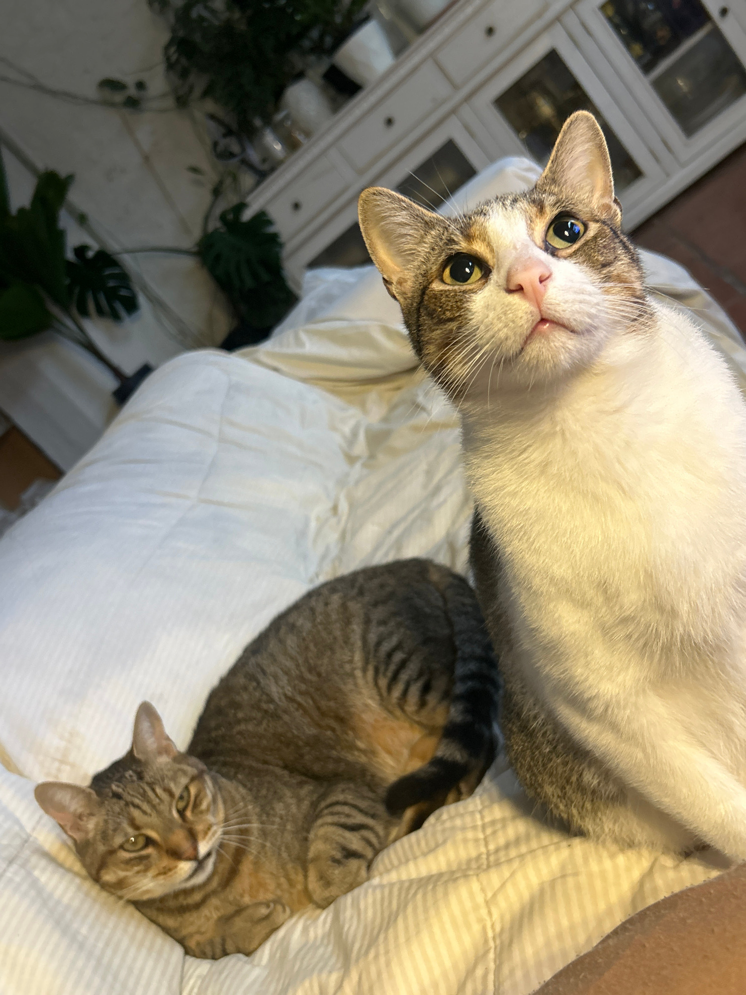 A high-angle shot shows two cats on a bed in an indoor setting. The cat closest to the camera is mostly white with tabby markings on its head. It's looking up, head slightly tilted. The second cat, al…read more