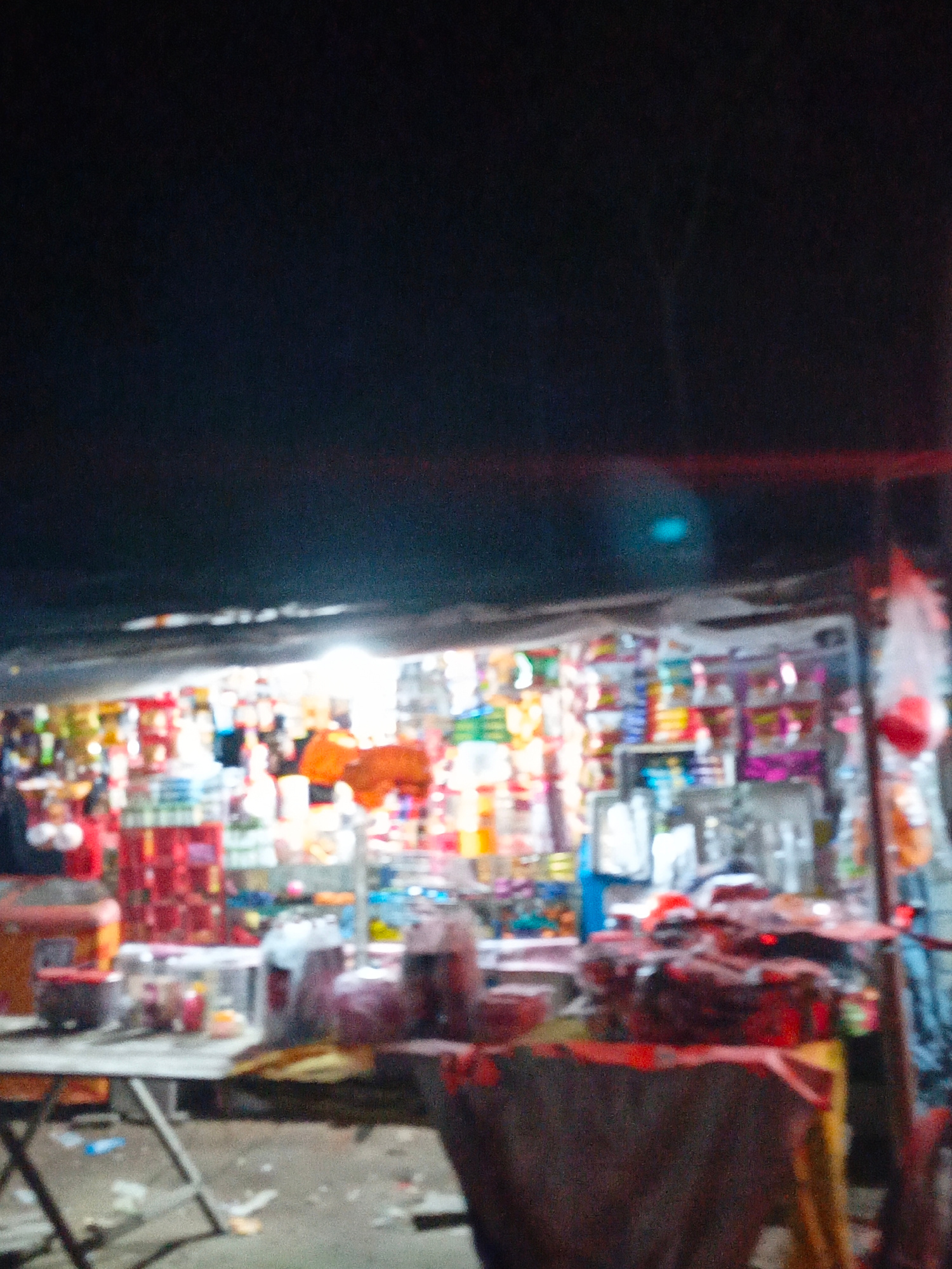 The image depicts a blurry, dimly lit scene in what appears to be a small shop or stall. The location is Unknown, Bangladesh. The shop is crammed with colorful merchandise, likely snacks, toys, and ho…read more