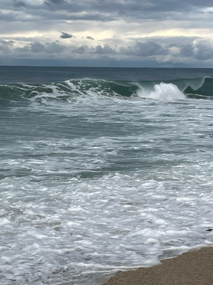 This image depicts a coastal scene in Alanya, Turkey. The foreground shows light brown sand of a beach on the bottom right, partially covered by white seafoam from receding waves. The midground is dom…read more