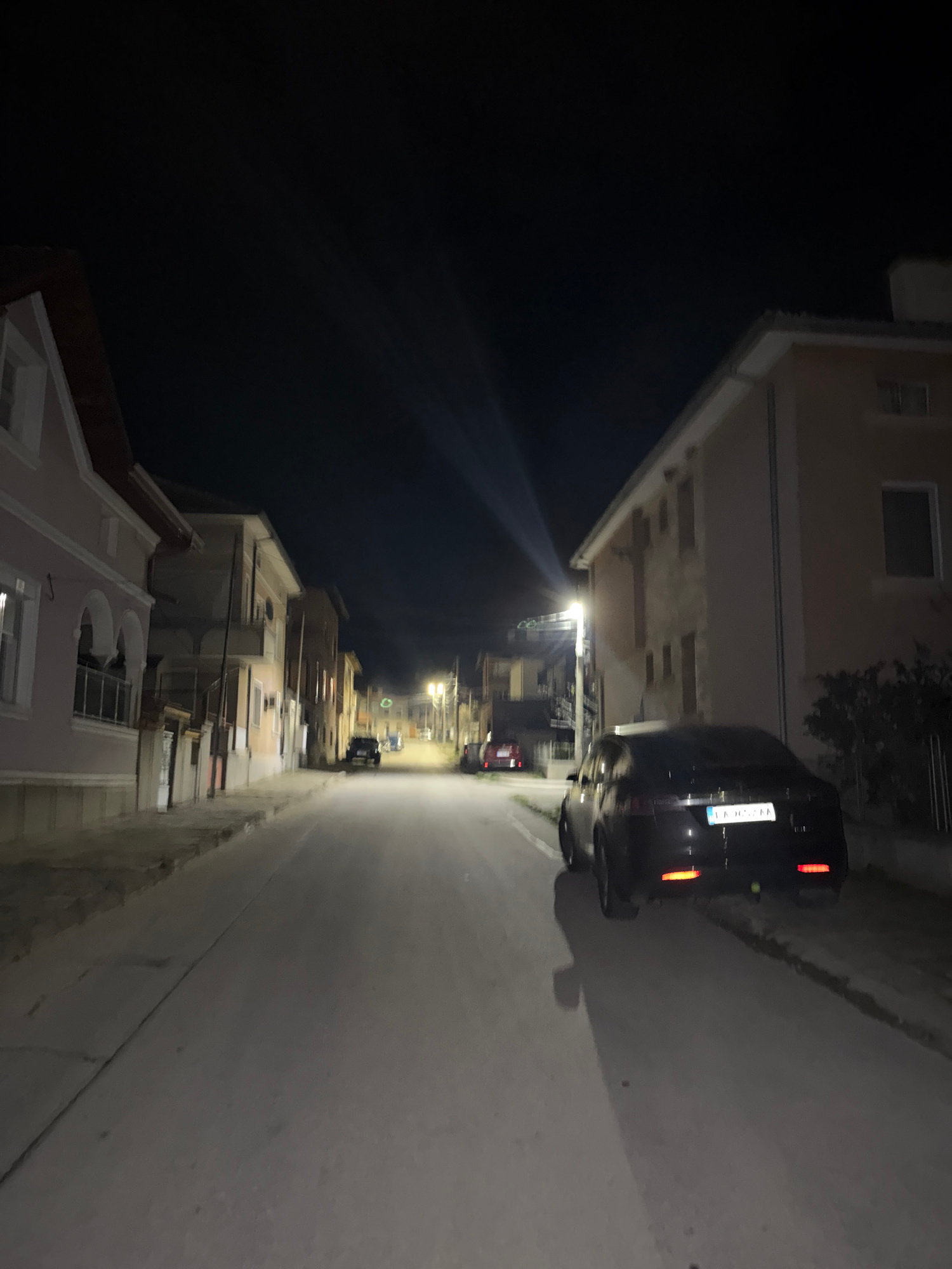 The image depicts a street in Panagyurishte, Bulgaria, at night. A dark-colored car is parked on the right side of the road, facing away from the viewer. The street stretches into the distance, flanke…read more