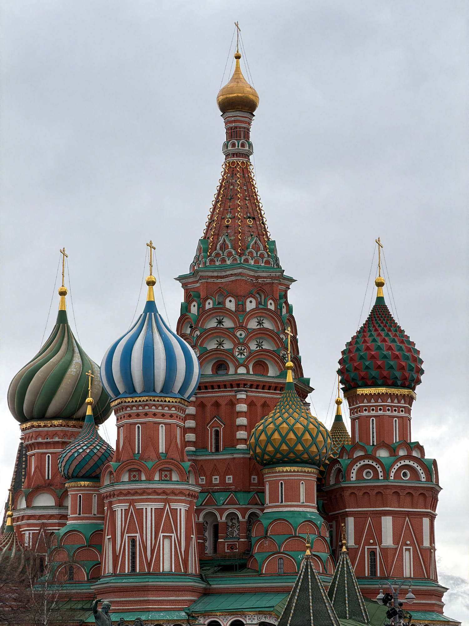 The image shows St. Basil's Cathedral in Moscow, Russia. The cathedral features multiple uniquely decorated domes with distinctive patterns and colors. The building is red brick with white and green a…read more