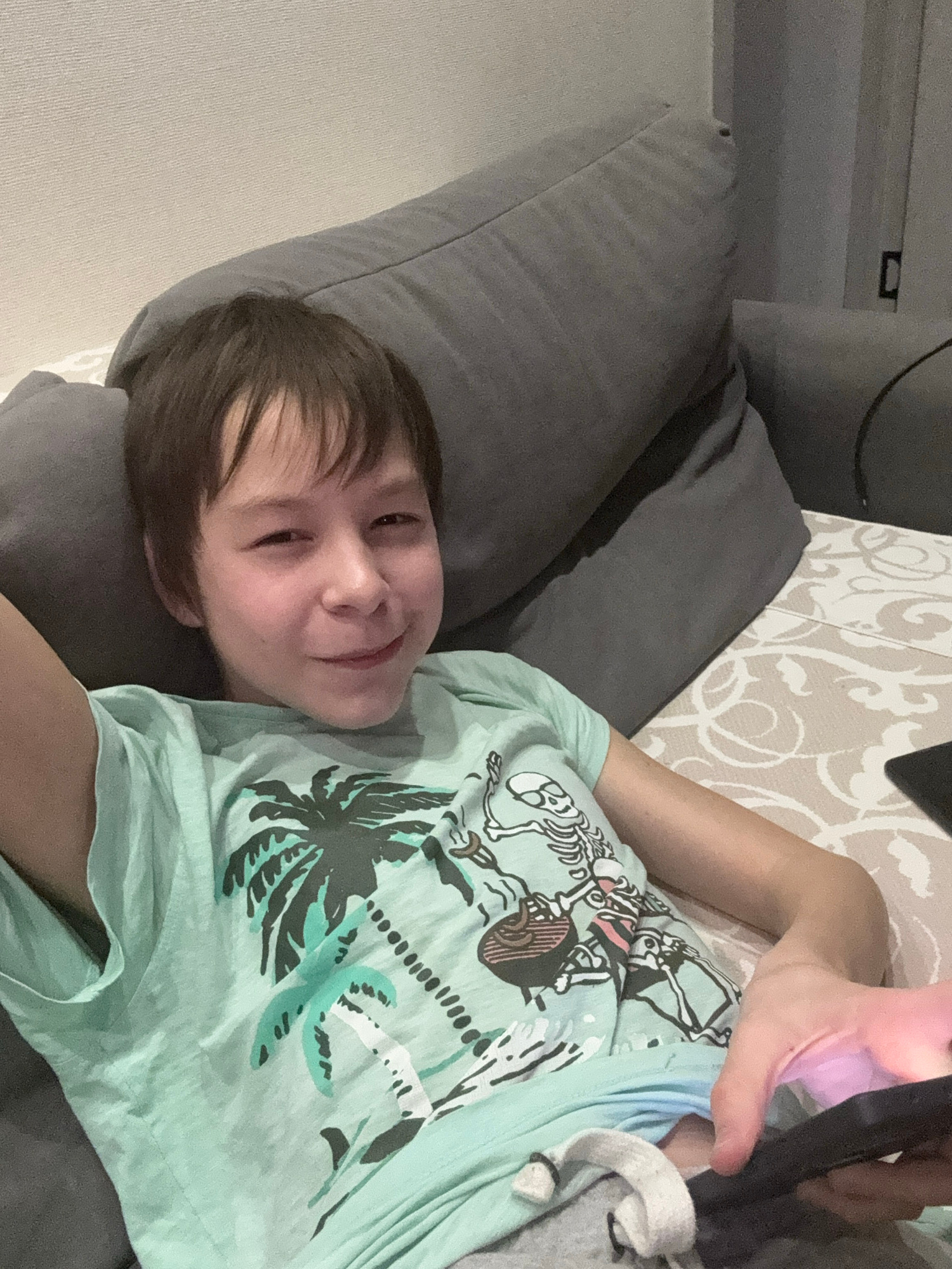 A young boy is lying on a gray couch with decorative pillows in what appears to be an indoor setting. He is wearing a light green T-shirt with a tropical and skull design. The boy is smiling and seems…read more