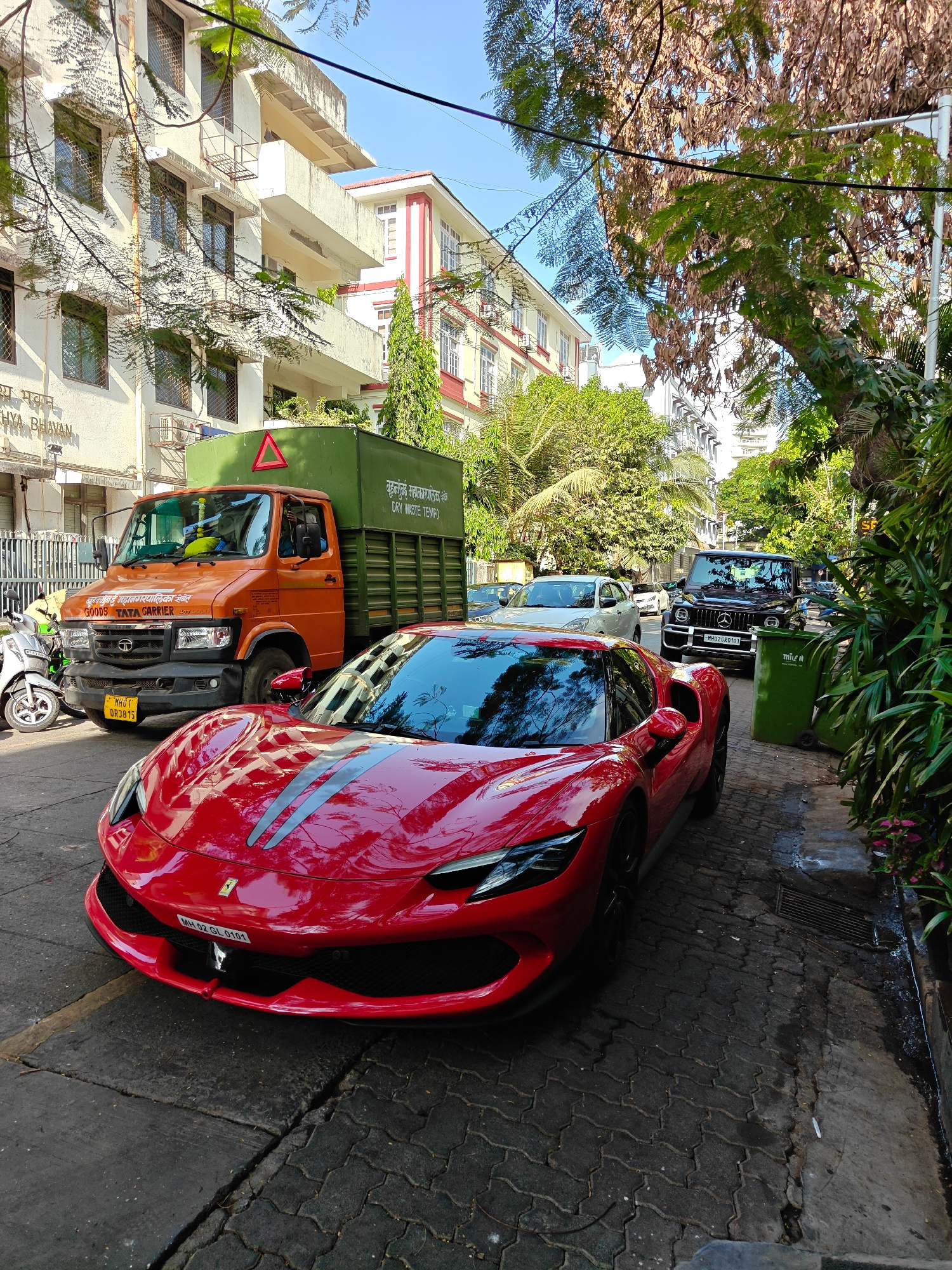 The image depicts a street scene in Mumbai, India. In the foreground, a red Ferrari with black racing stripes is parked on a paved road. Behind the Ferrari is an orange Tata Carrier truck with a green…read more