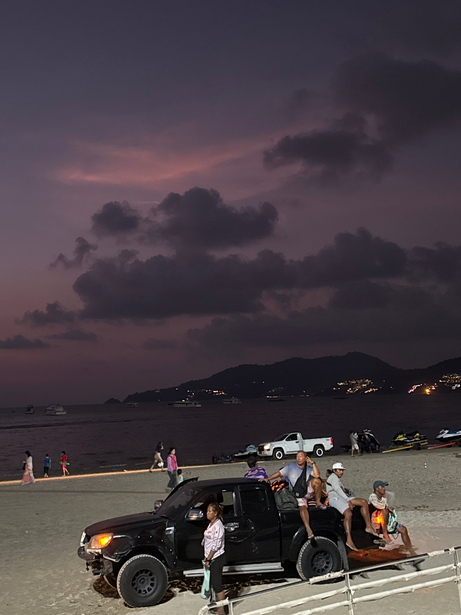 At Patong, Thailand, a dark, overcast twilight illuminates the beach. People are scattered along the sand, some near a black pickup truck parked by a low wall. Several individuals are sitting on the t…read more