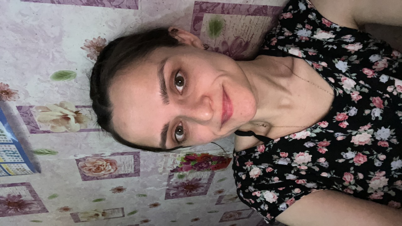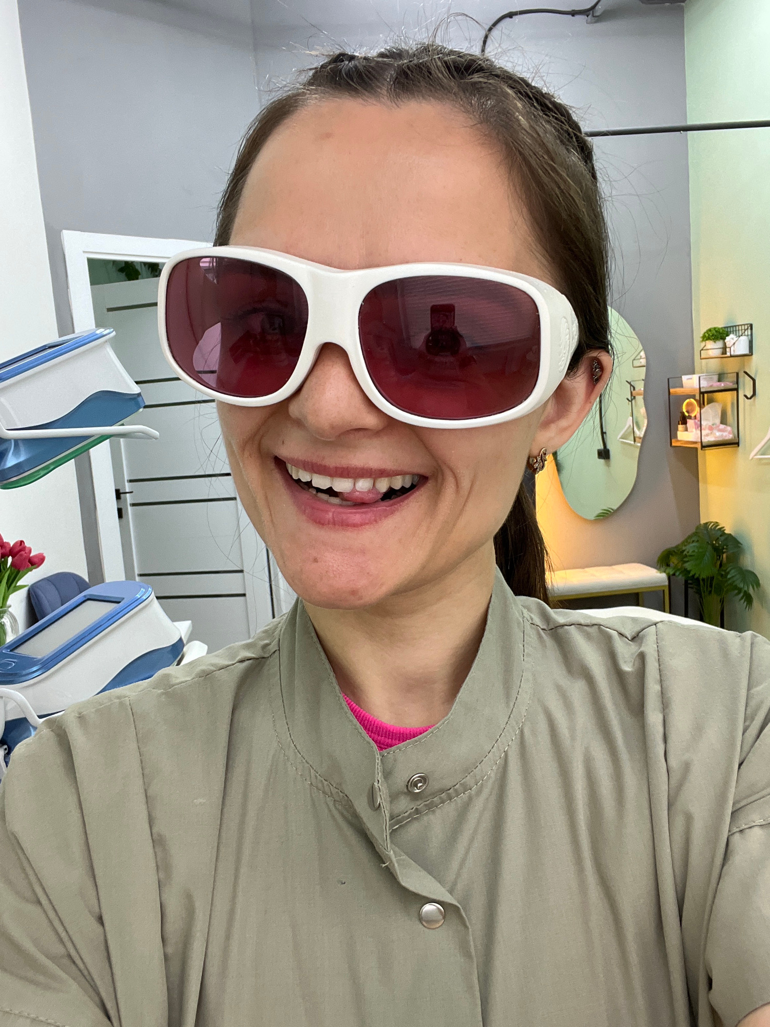 A woman with medium-length brown hair styled in a braid along her hairline is smiling broadly while wearing large, white sunglasses with burgundy lenses. She is wearing a light brown collared shirt or…read more