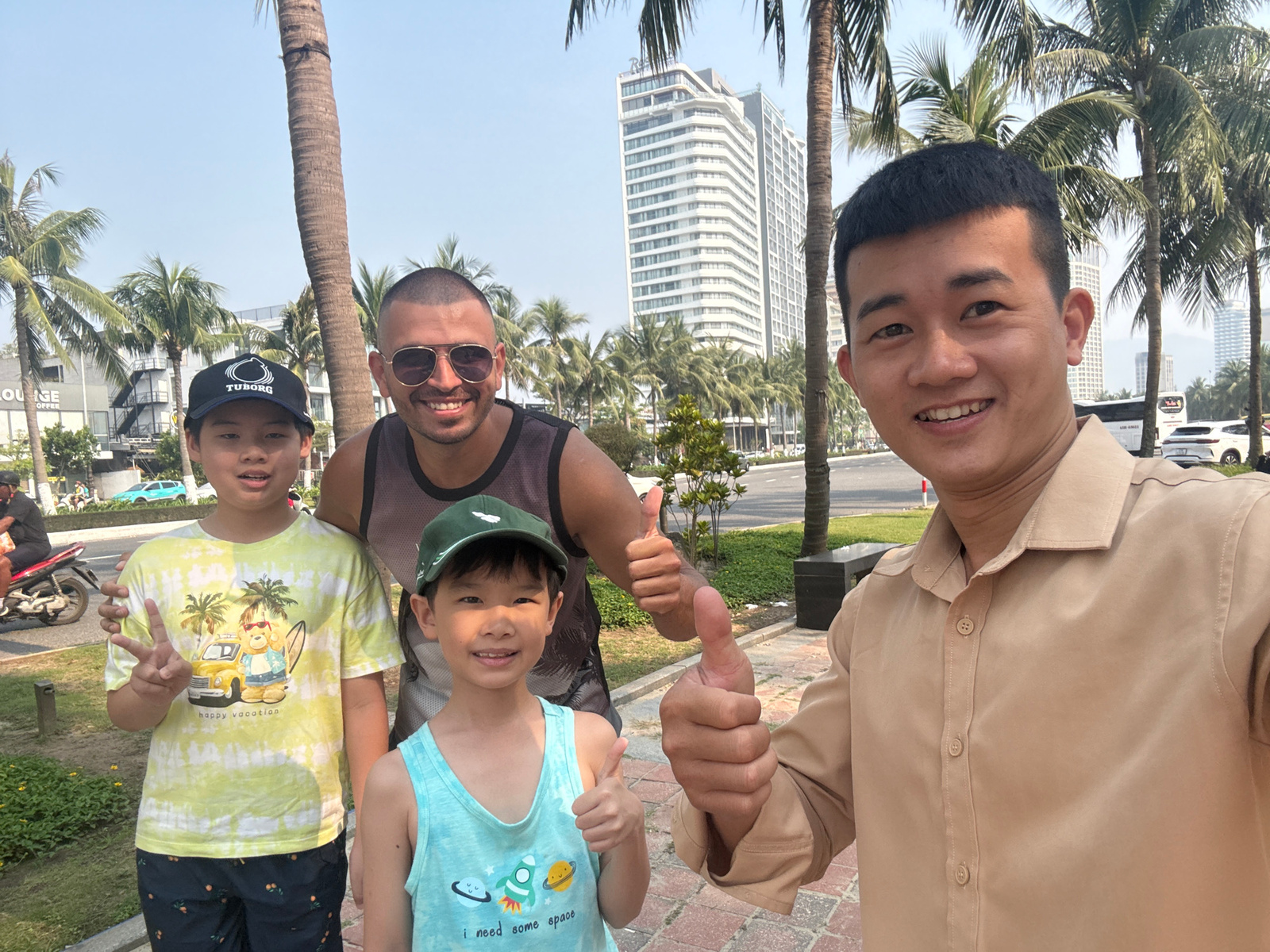 The photograph depicts a group of people – two adults and two children – posing for a picture outdoors in what appears to be a coastal area. The adult on the right, wearing a light brown shirt, is hol…read more