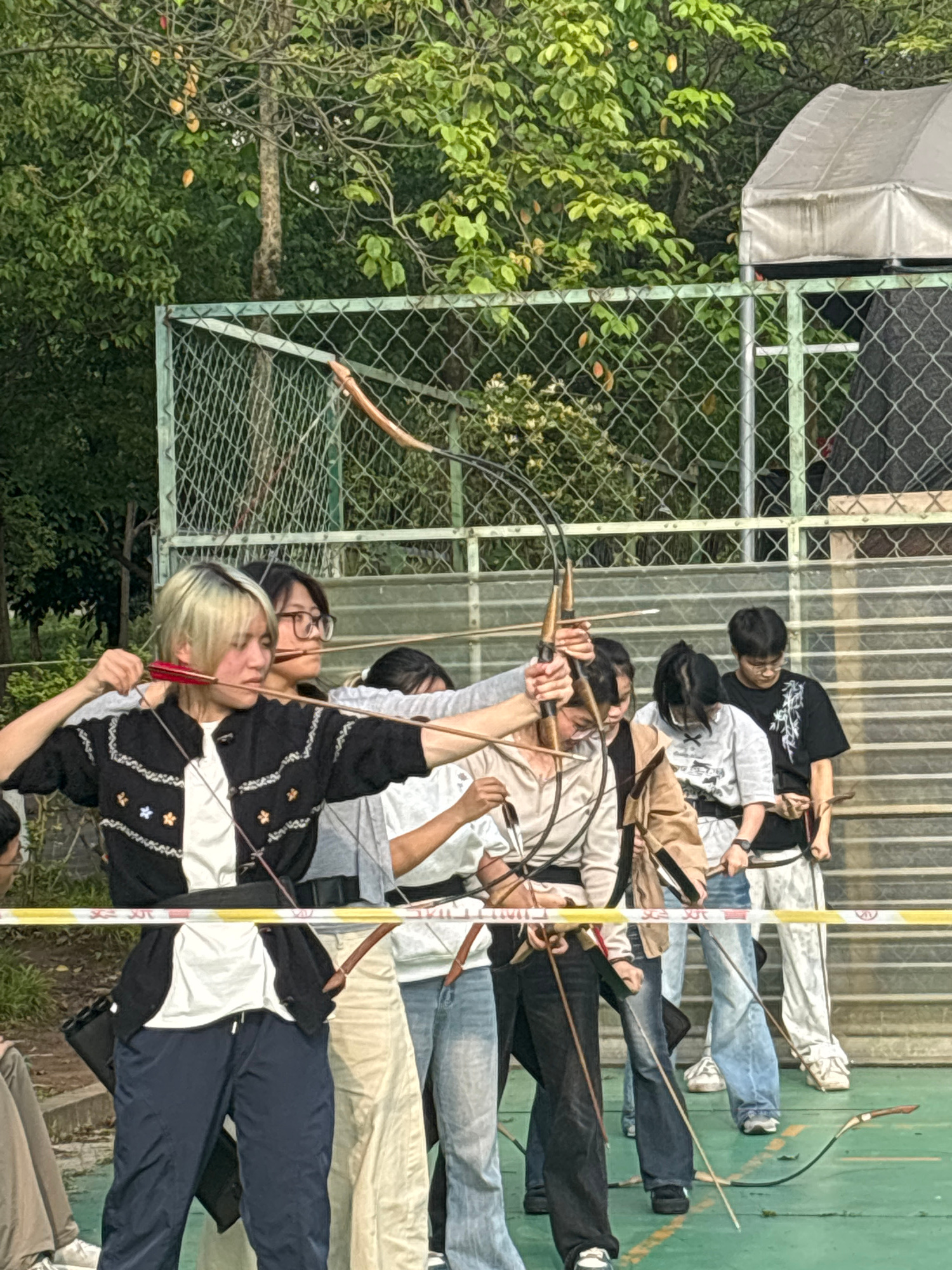A group of people stand in a line outdoors, holding bows and arrows, presumably participating in archery. They appear to be aiming or preparing to shoot. The background features a fence, trees, and a…read more