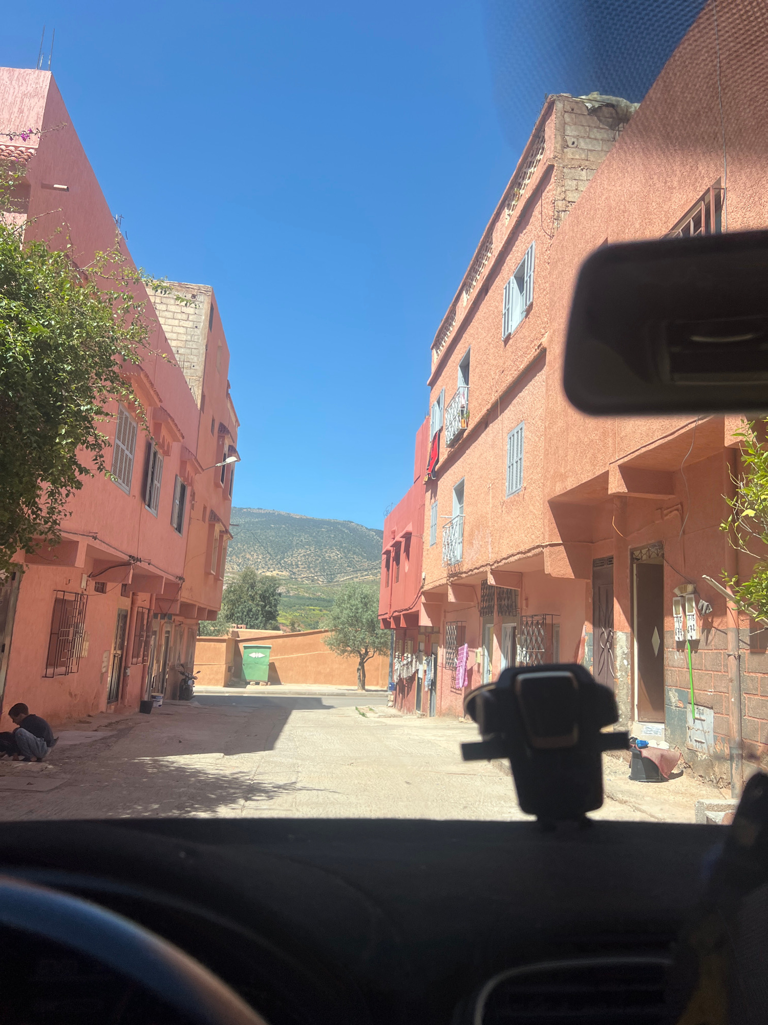 The image, taken from inside a vehicle in the city of Ouaouizert, Morocco, depicts a street scene characterized by adjacent, multi-story, coral-colored buildings with multiple windows. The sky is clea…read more
