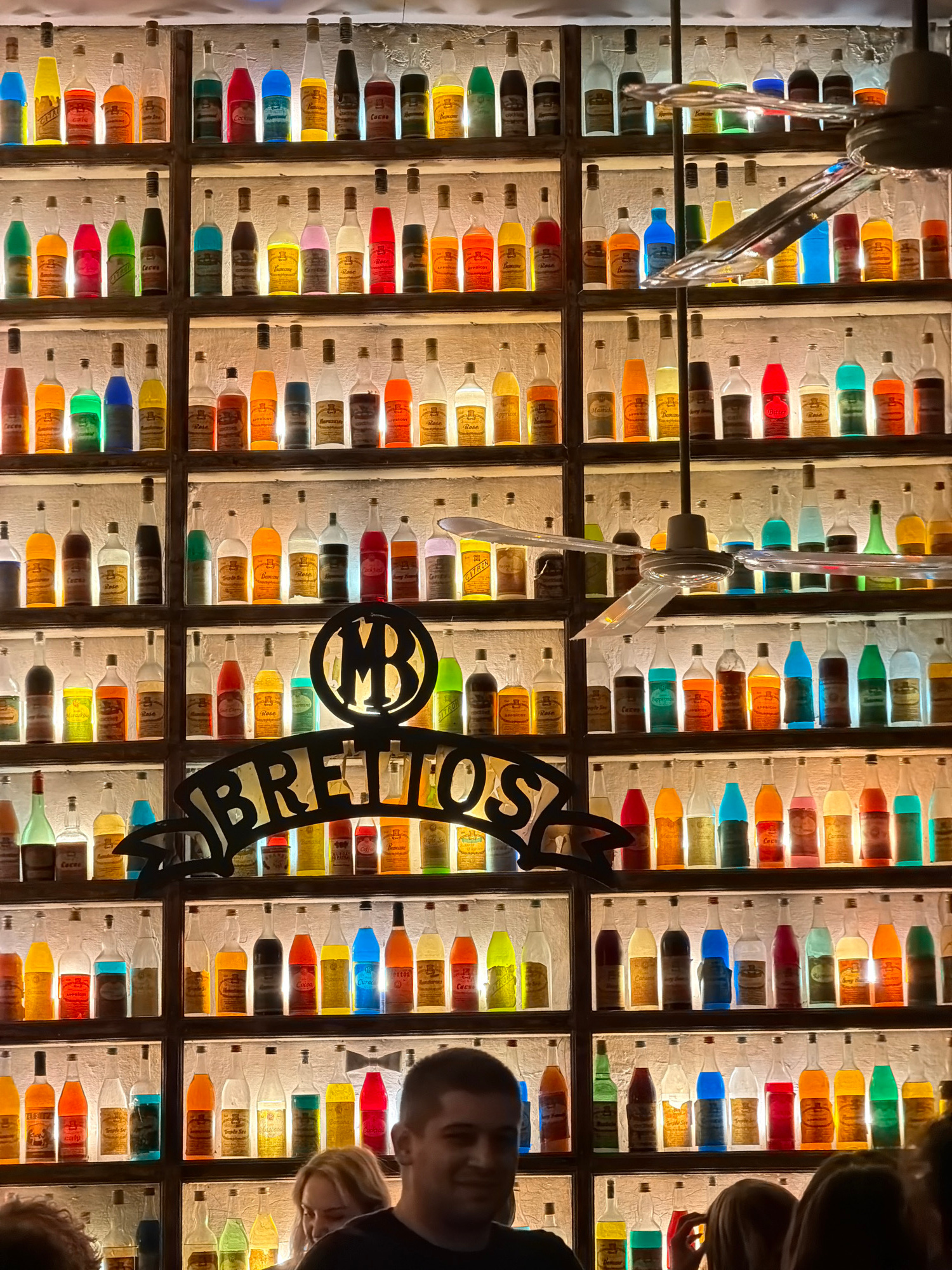 This image depicts the illuminated bottle display inside Brettos Bar, located in the Plaka district of Athens, Greece. The central feature is a large wall comprised of numerous wooden or metal shelves…read more