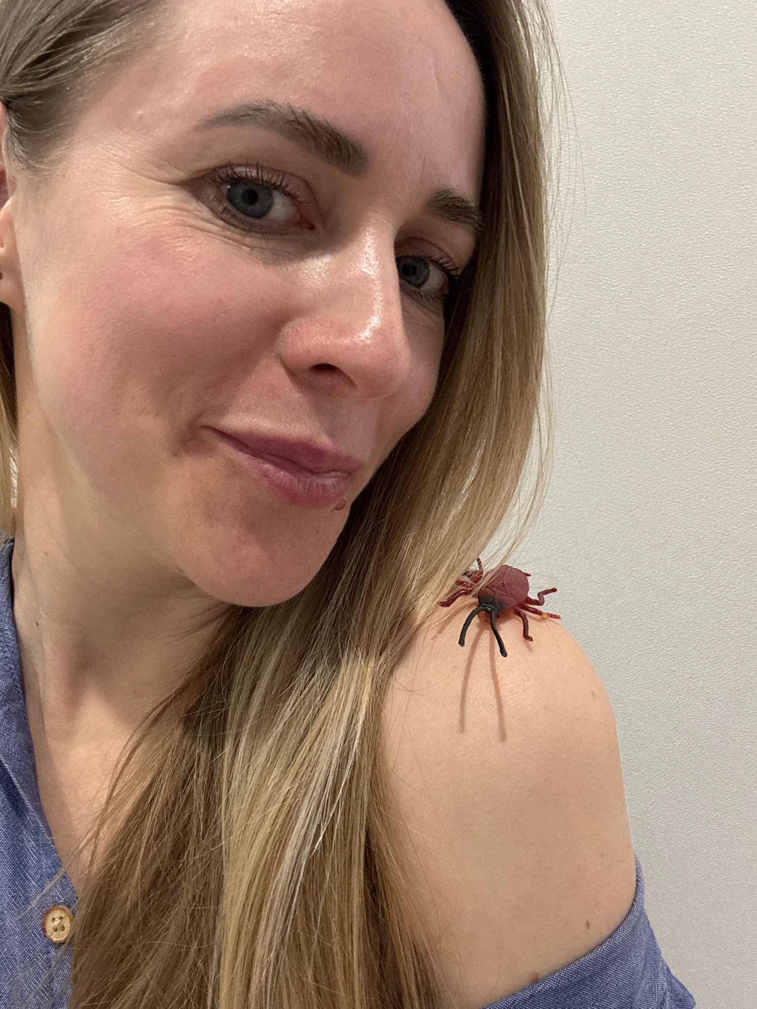 A woman with blonde hair and blue eyes is pictured in a close-up shot. She has fair skin and is wearing a blue shirt. A red plastic bug with black legs is positioned on her shoulder. The background is…read more
