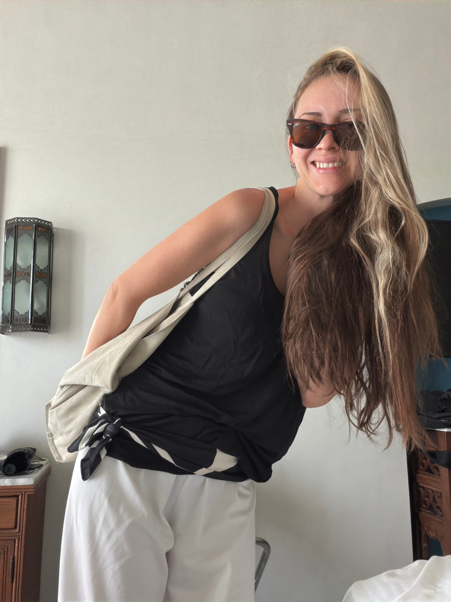 A woman with long blonde and brown hair wearing sunglasses, a black tank top, and white pants stands indoors. She is smiling. A beige bag hangs from her shoulder. A decorative wall fixture is visible…read more
