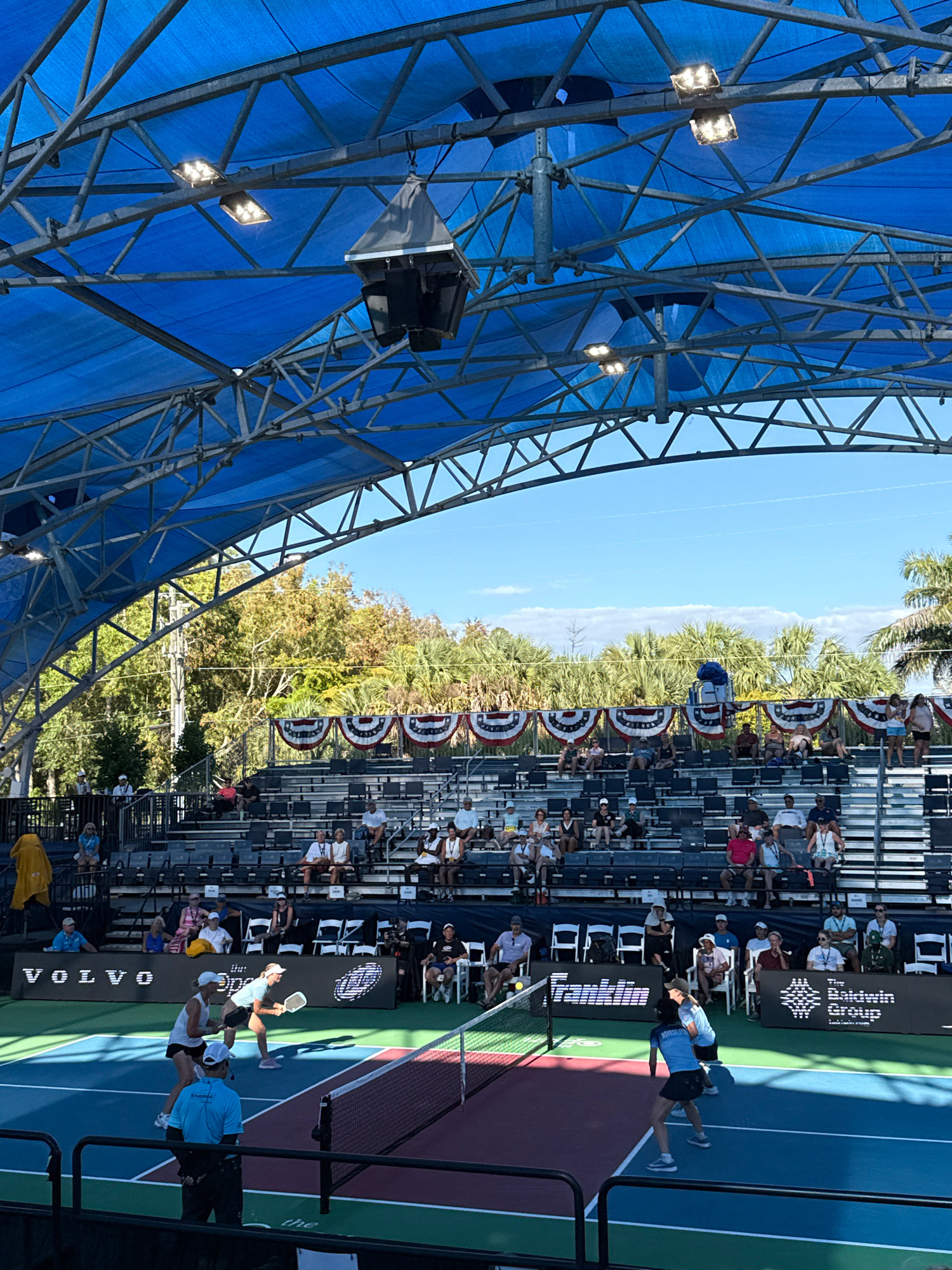 This image captures an outdoor pickleball match played under bright daylight, likely in Naples, United States, given the context and presence of palm trees. The scene is dominated by a large, blue fab…read more
