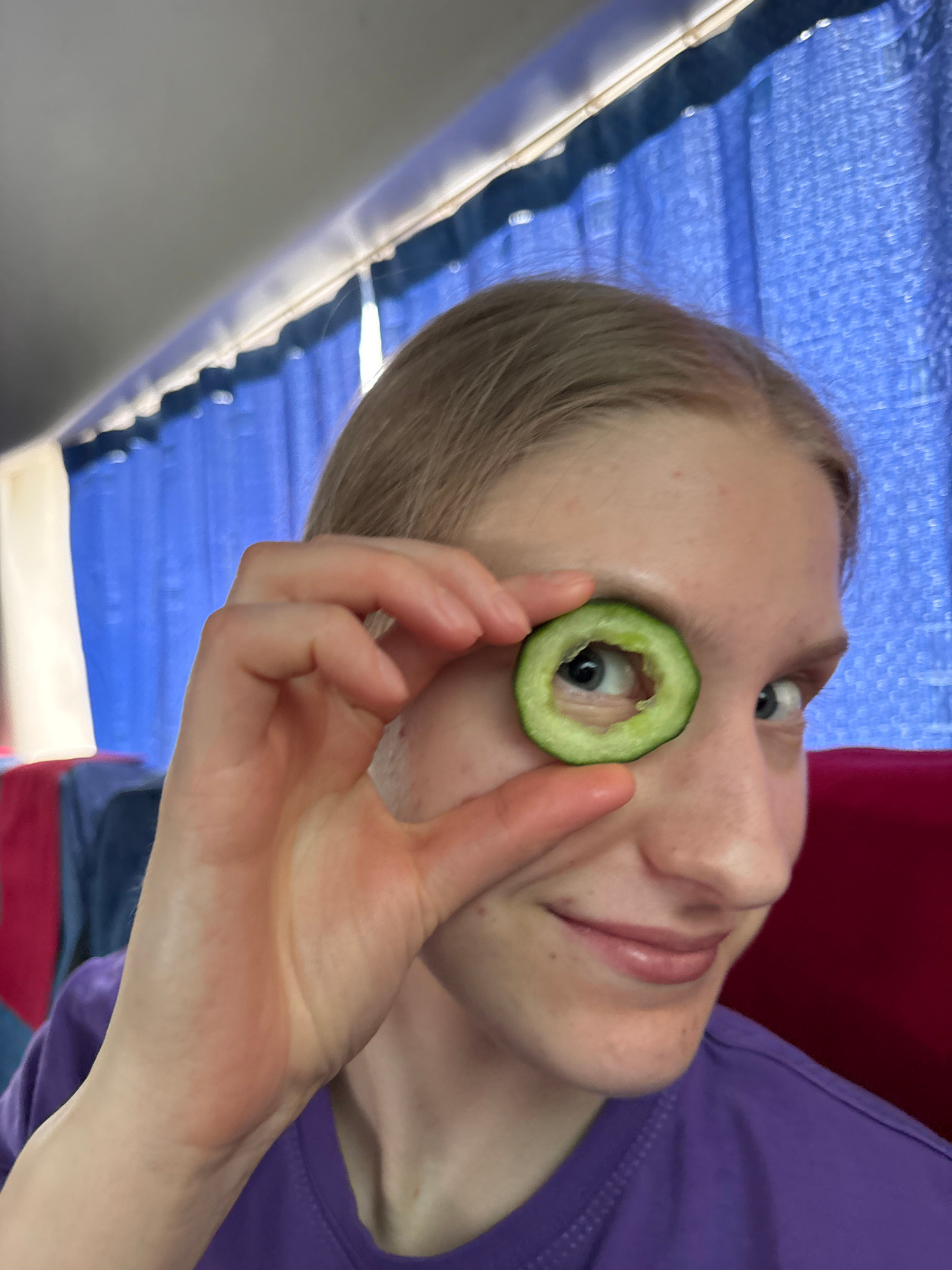 The image shows a fair-skinned person with blonde hair holding a slice of cucumber in front of their left eye. The person is wearing a purple shirt. The background includes blue fabric and a red surfa…read more