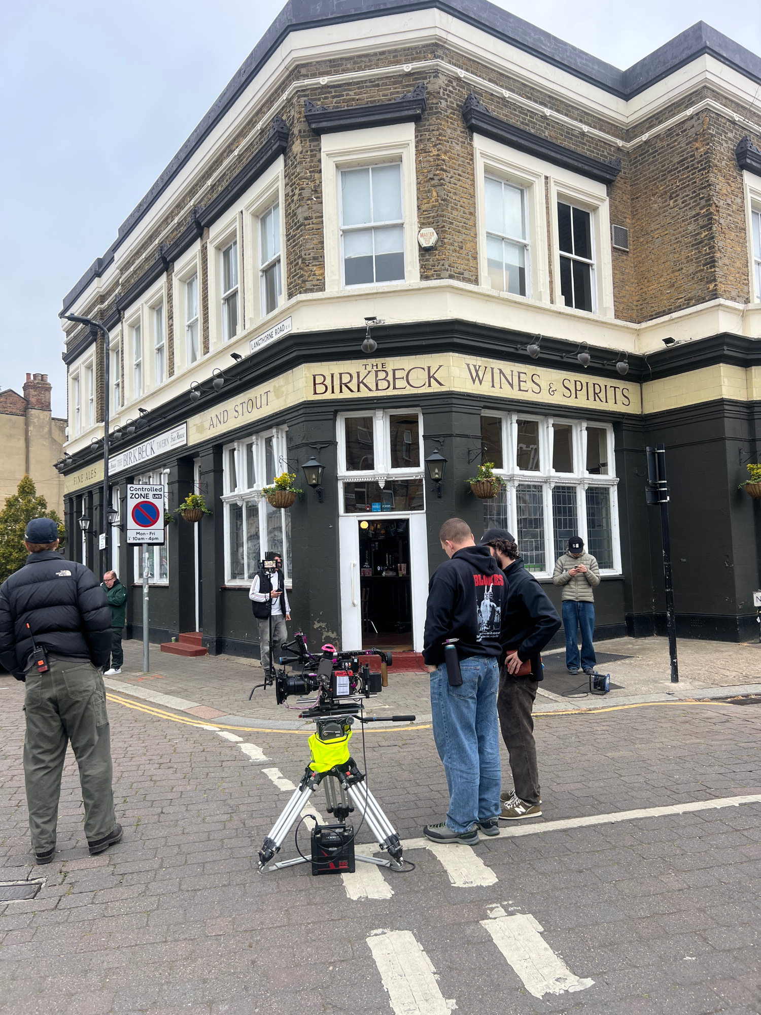 An outdoor scene depicts what appears to be a film or video shoot taking place on a paved street in front of a building identified as "THE BIRKBECK WINES & SPIRITS". The building, a traditional brick…read more