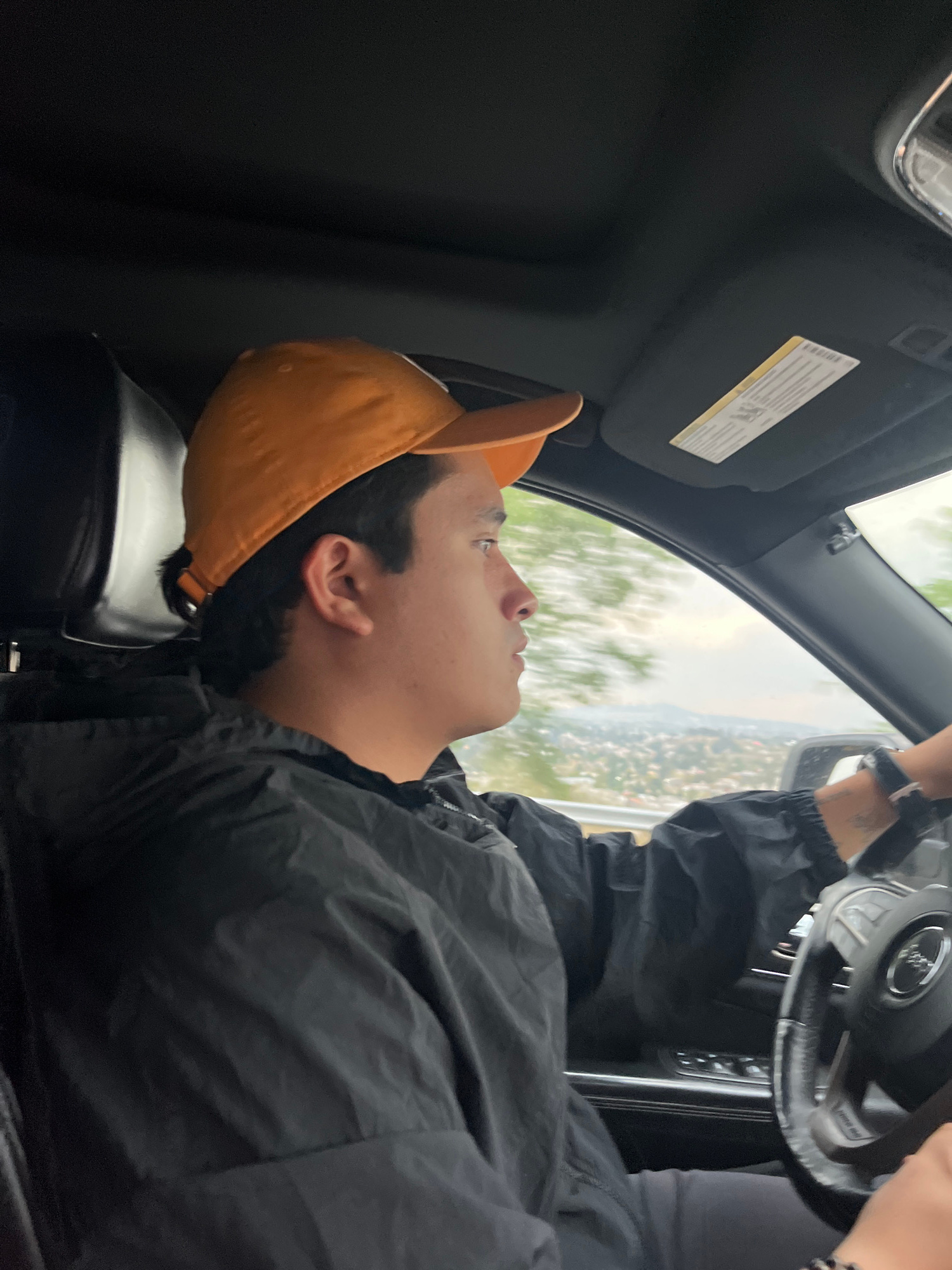A man wearing an orange cap and a black jacket is seated in the driver's seat of a car. He is looking upwards and towards the right, in the direction of the car's windshield. His hands are on the stee…read more
