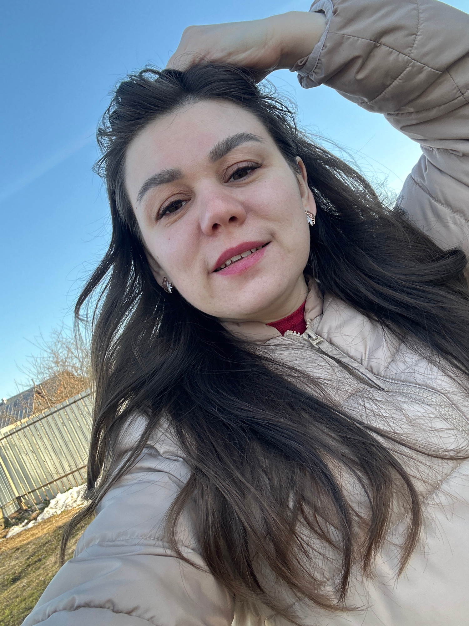 The image features a young woman in a low-angle, upward-facing shot, likely a selfie, taken outdoors in Chaikovsky, Russia. Her face, framed by long, dark brown hair, is the primary subject. She has d…read more