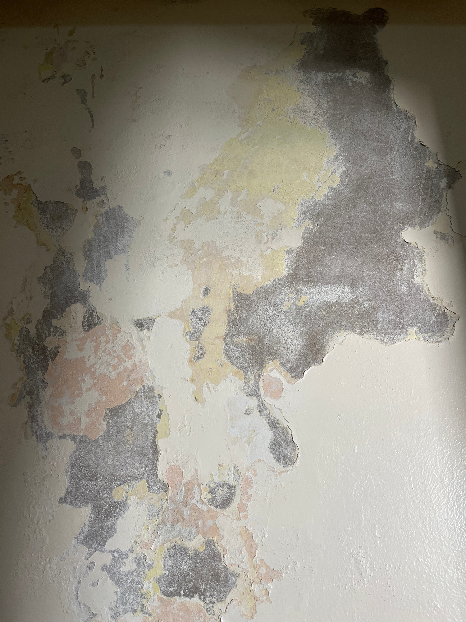 The image depicts a wall in a state of disrepair. Paint is peeling extensively, revealing underlying layers of grey, yellow, and pink. The texture is rough and uneven, with visible cracks and areas wh…read more