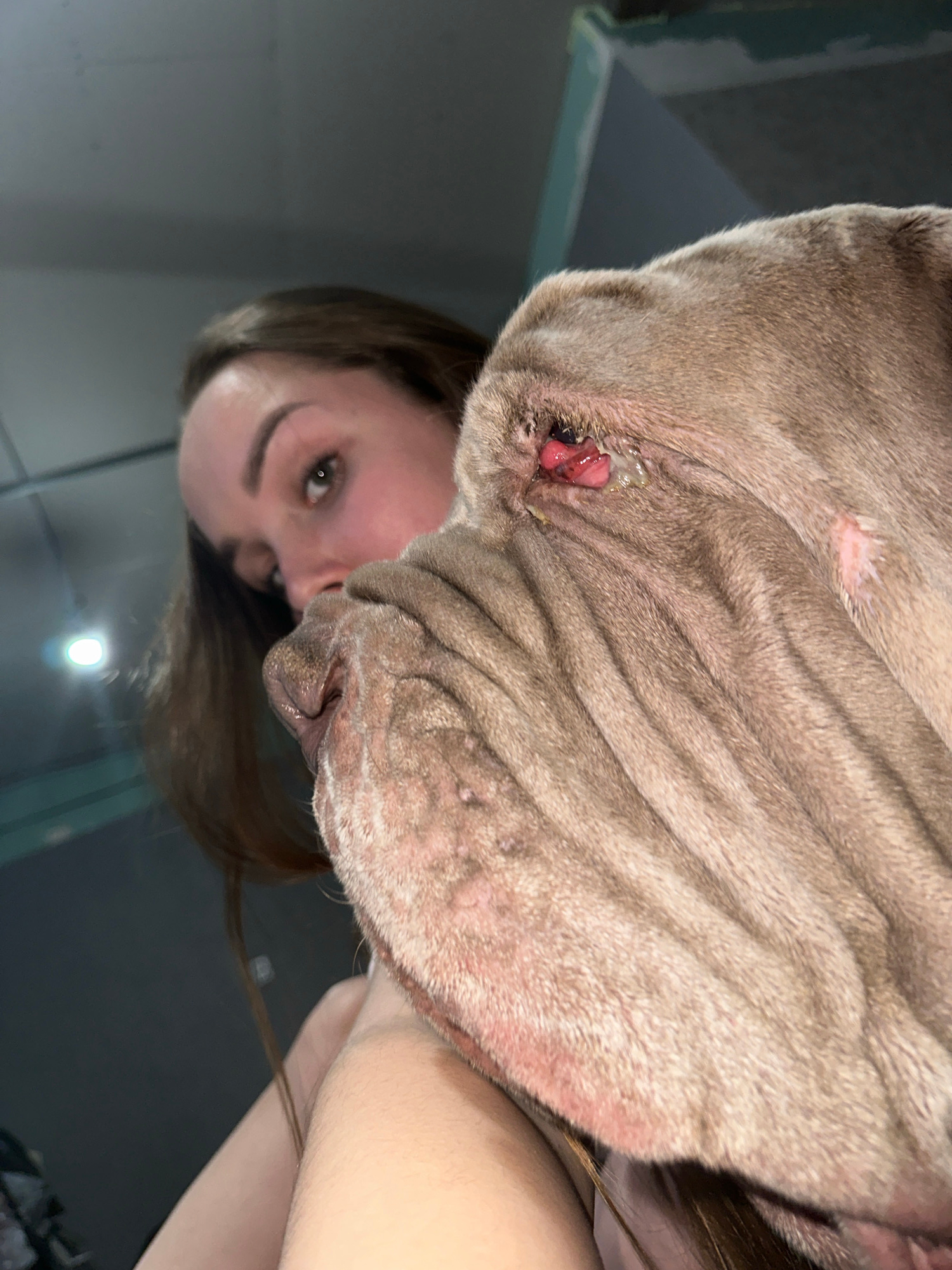 A close-up shot features a woman holding a Shar Pei dog, focusing on the dog's head. The dog has wrinkly, light brown fur. There is a growth, possibly a cherry eye or a tumor, protruding from the cornβ¦read more