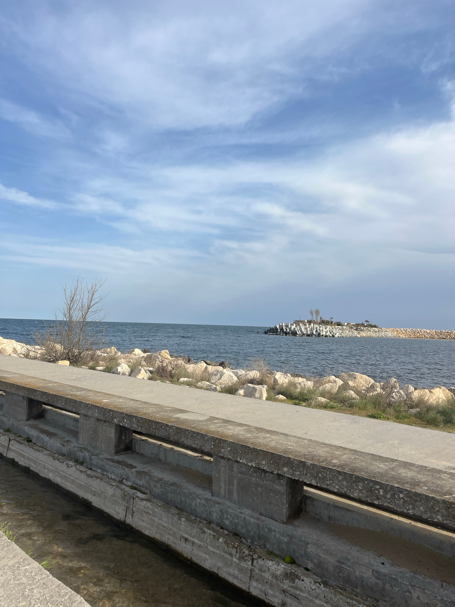 The image captures a concrete bridge over the Black Sea in Varna, Bulgaria. The sky is partly cloudy. The sea is slightly choppy, with a rocky breakwater visible in the distance. The bridge itself is…read more