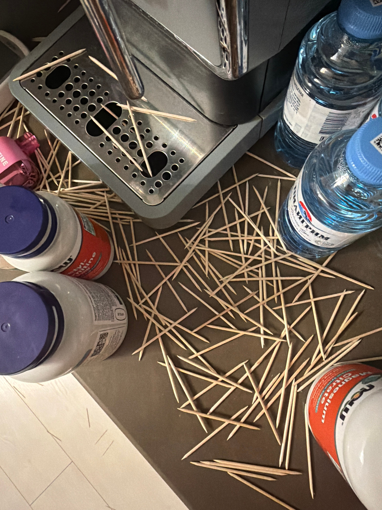 The image shows a collection of objects on a brown surface, possibly a table or shelf, against a background of a light-colored surface. The visible objects include: * Two bottles of water, labeled…read more
