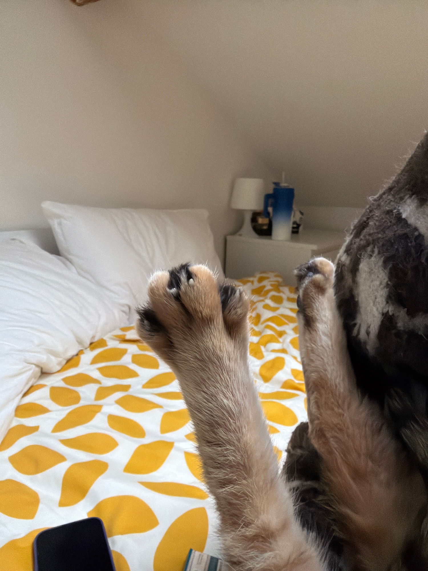 A close-up shot from a low angle features a dog's paws and legs hanging over the edge of a bed. The bed is made with white sheets and pillows, and one pillow has a yellow leaf pattern. A black smartph…read more