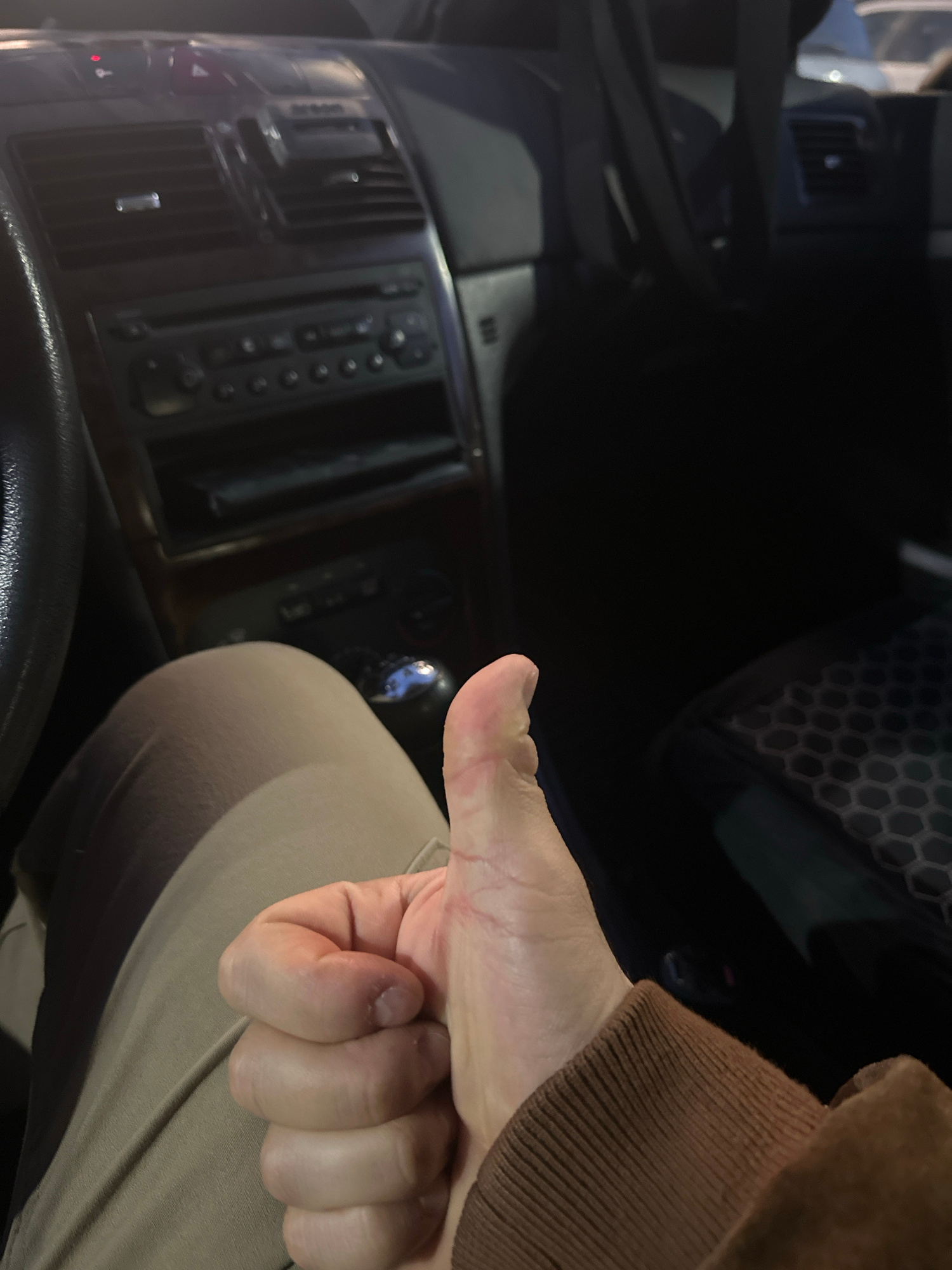 The image appears to be taken from inside a car, focusing on the driver's side. A hand is visible in the foreground, giving a thumbs-up gesture. The car's dashboard, vents, radio, and gear shift are p…read more