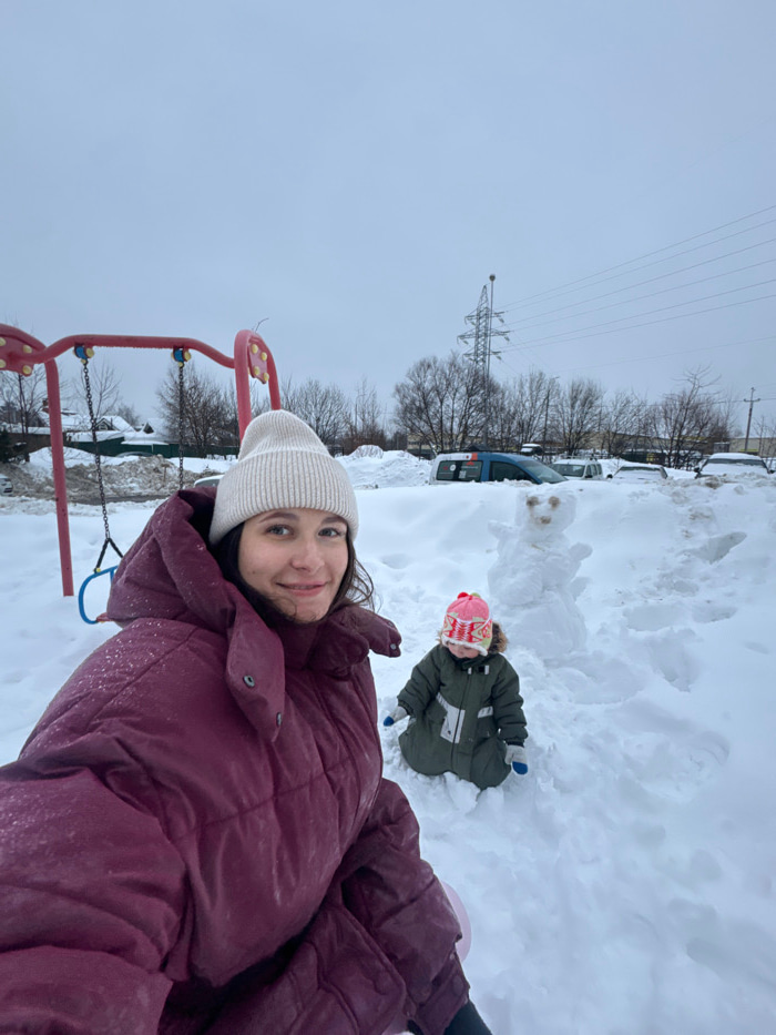 An outdoor, winter scene depicts a woman and a child enjoying the snow. The primary subject is a woman in the foreground, positioned on the right side of the frame, smiling warmly at the camera. She i…read more