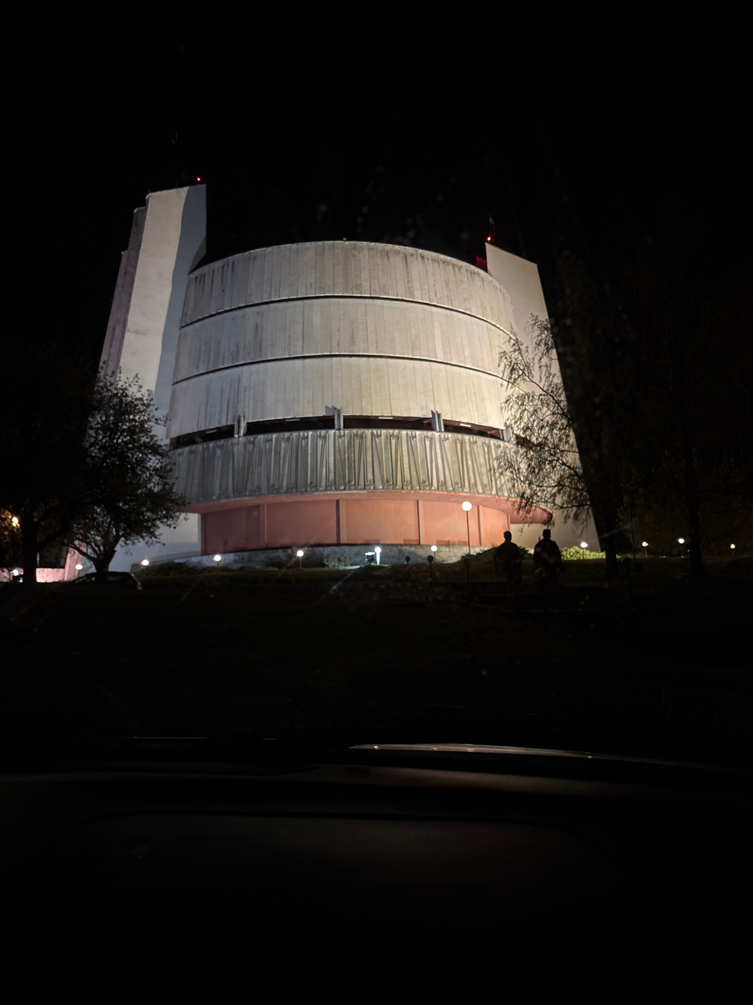 The image shows the Pleven Panorama, a monument in Pleven, Bulgaria, at night. The panorama is illuminated, showcasing its distinctive cylindrical shape and layered facade. There's a tree with bare br…read more
