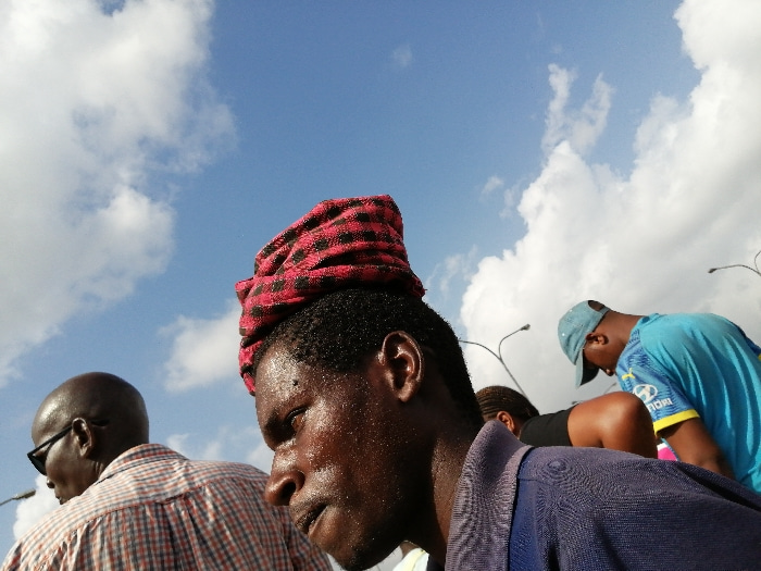 This outdoor shot, set against a bright blue sky dotted with scattered white clouds, captures a group of people in Dar es-Salaam, Tanzania. In the immediate foreground, a man with dark skin, his face…read more