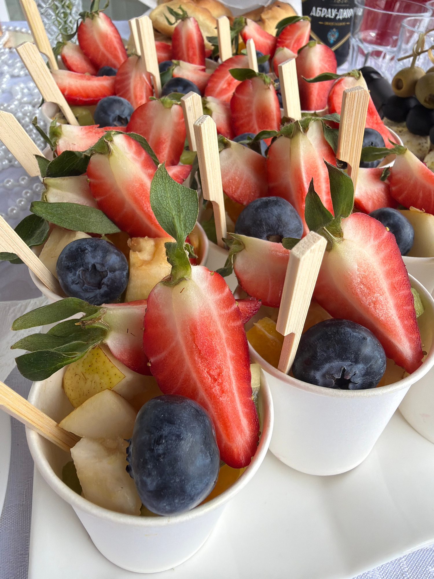 This image presents a close-up view of an array of fresh fruit skewers, thoughtfully arranged in small, individual white paper cups. Each cup contains a wooden skewer holding a selection of fruits, pr…read more