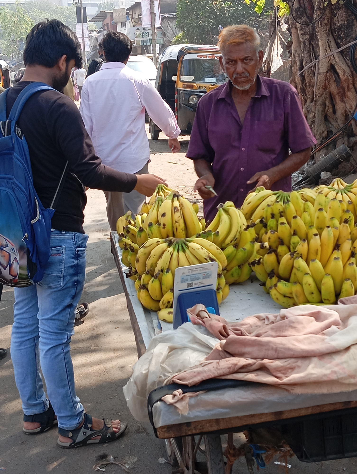 **Location:** Mumbai, India **Scene:** A daytime street scene featuring a banana vendor interacting with a customer. **People:** * **Vendor:** An older man with graying hair and a mustache, wearing…read more