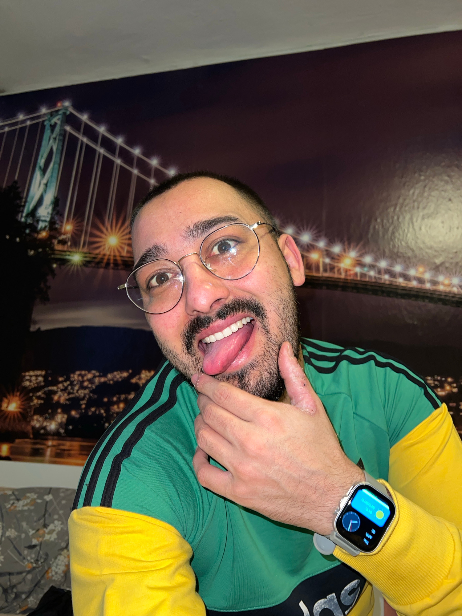 A person is posing with their tongue out, wearing round glasses and a green and yellow Adidas tracksuit, and an Apple Watch with a blue and white watch face. The background is a mural of a bridge at n…read more