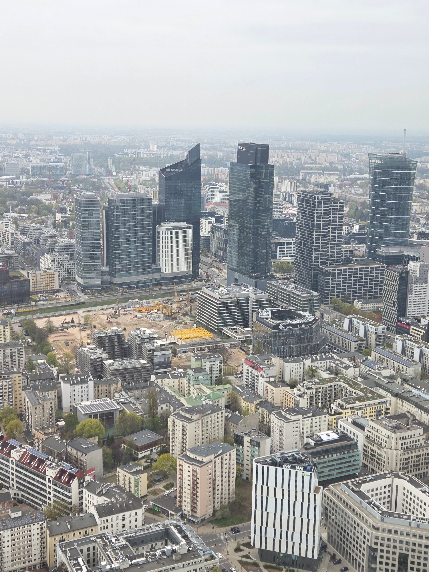The image shows an aerial view of Warsaw, Poland, with a focus on the city's downtown area. Several tall skyscrapers dominate the skyline, some bearing logos like "Samsung" and "Hertz". Construction s…read more