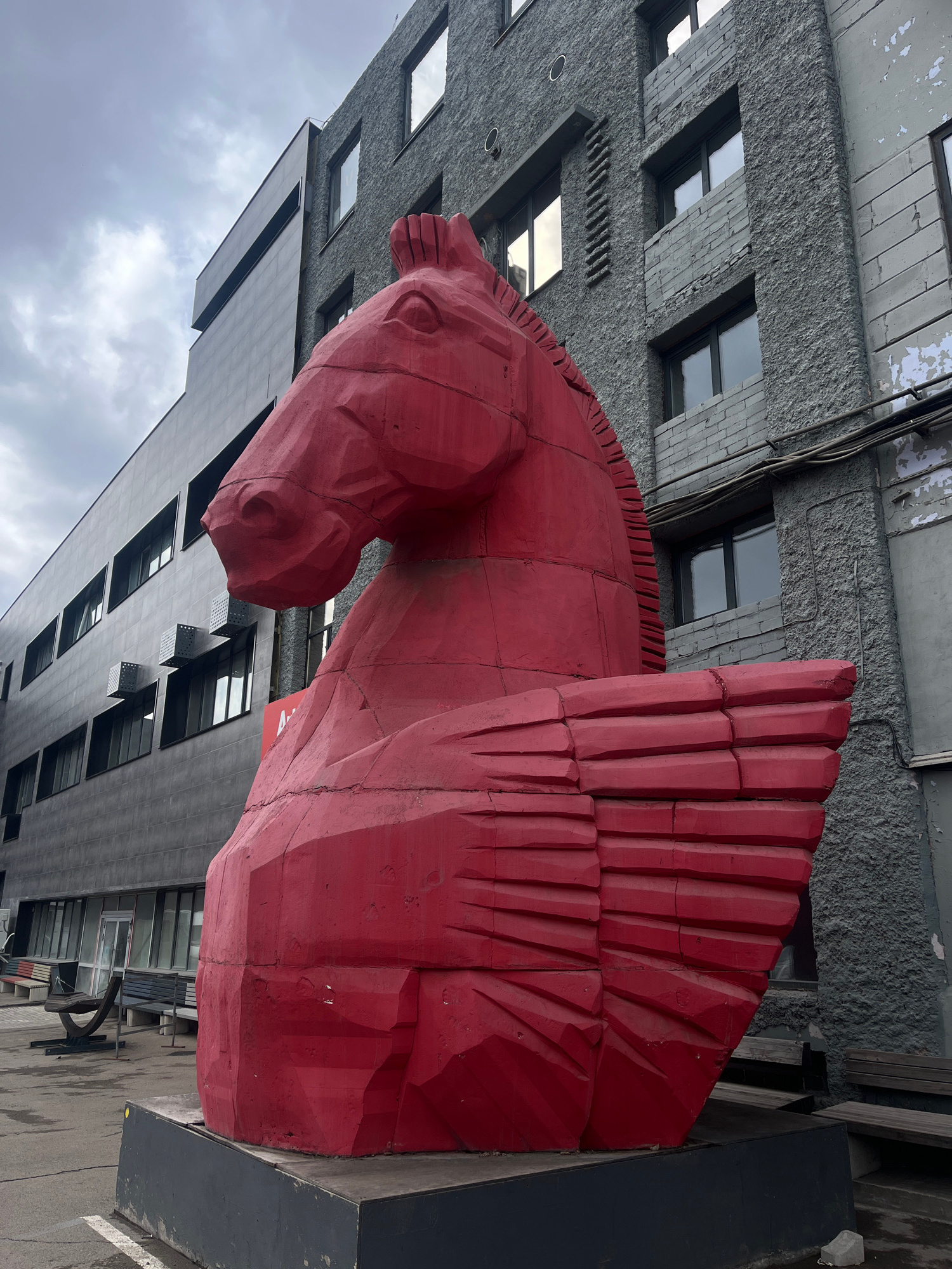 The image shows a large, red, sculpture of a winged horse head in front of a gray, multi-story building. The sculpture appears to be made of wood, with visible seams and a blocky construction style. I…read more