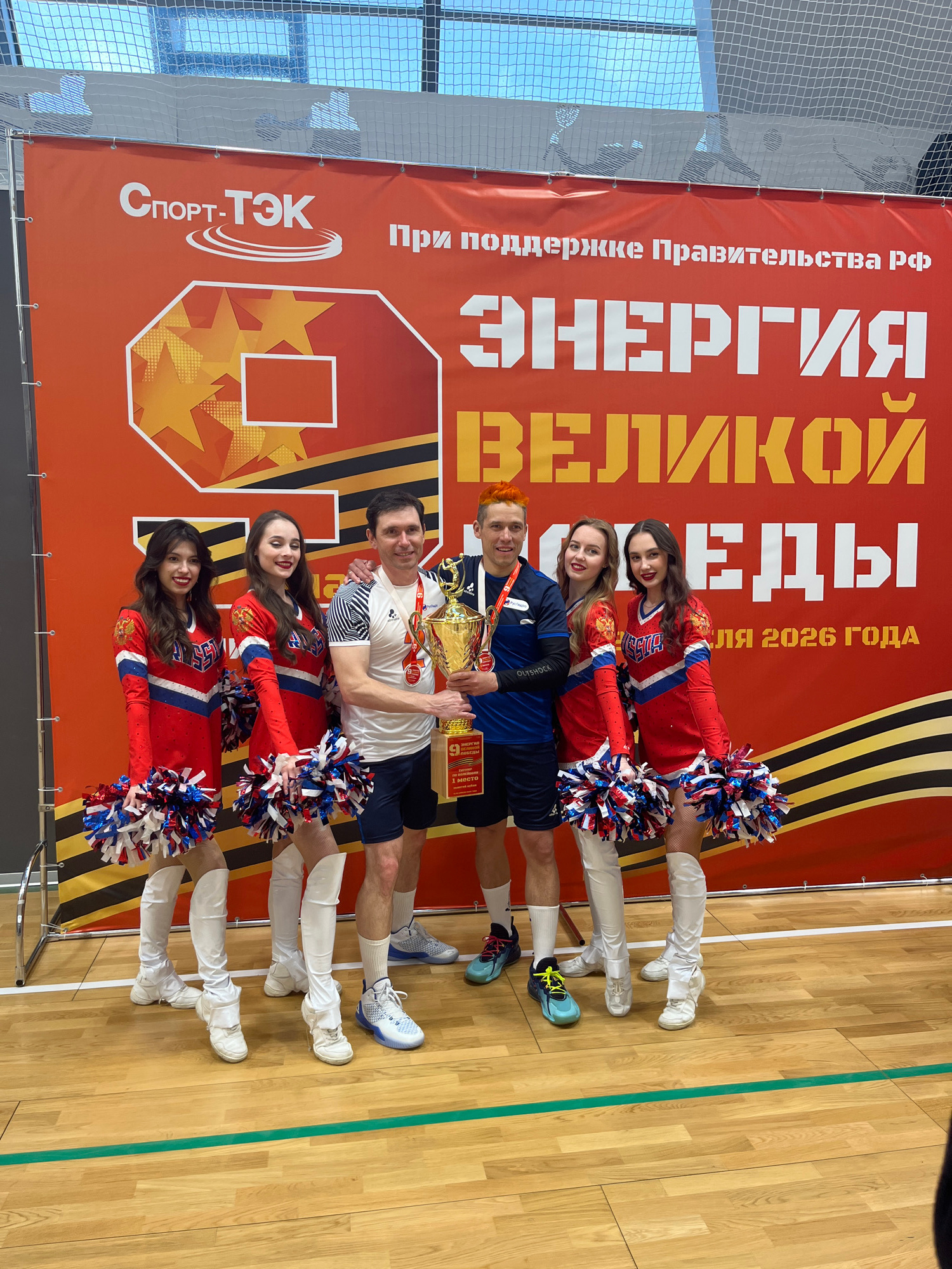 The image shows a group of people posing in front of a banner. The banner features the logo of "Спорт-ТЭК," and text in Russian reading "При поддержке Правительства рф ЭНЕРГИЯ ВЕЛИКОЙ ВОВЕДЫ ля 2026 Г…read more