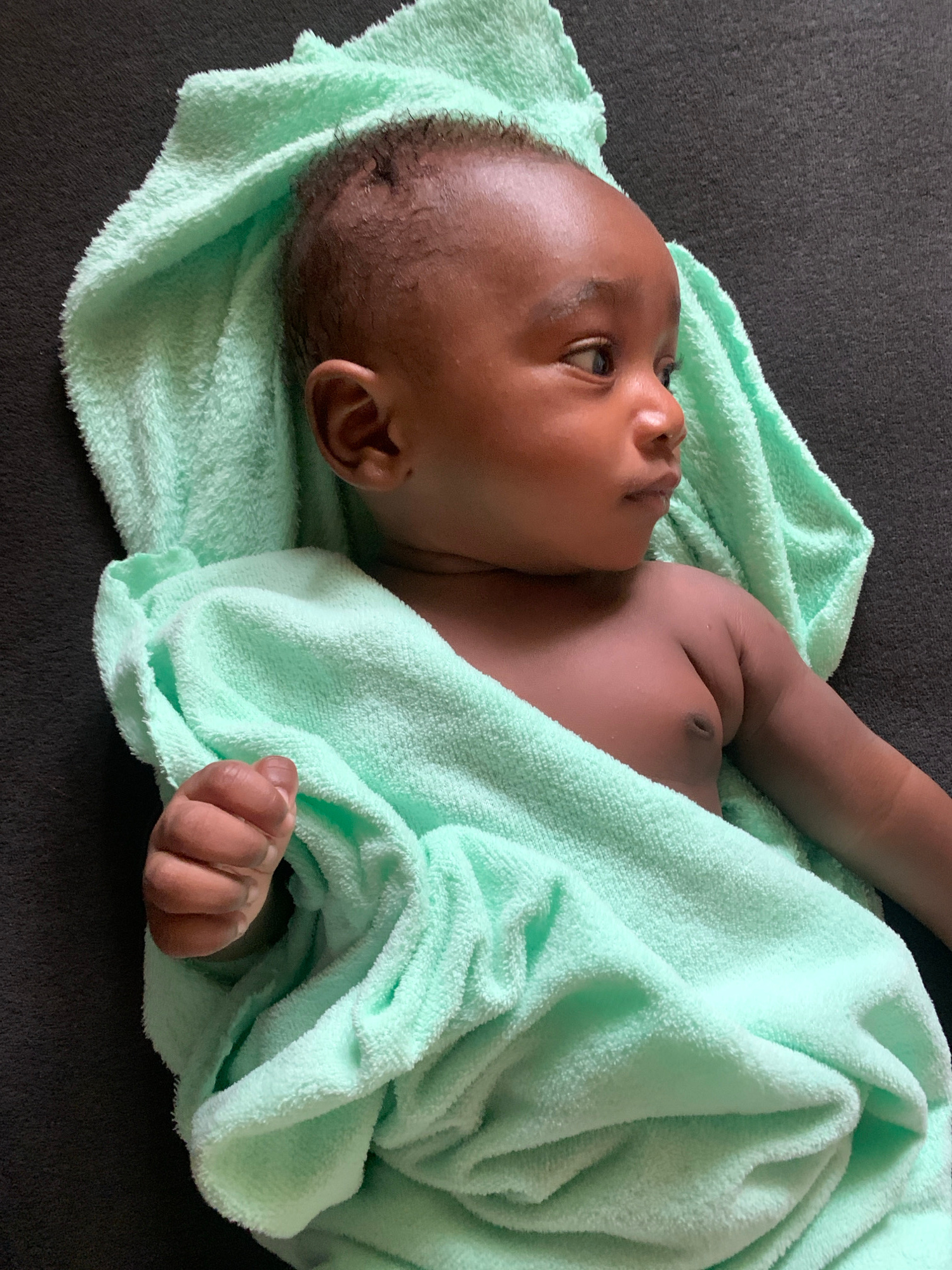 A baby lies on a dark surface partially wrapped in a light green towel. The baby's head is towards the left of the frame, and the body angles towards the upper right. The baby is dark-skinned and is l…read more